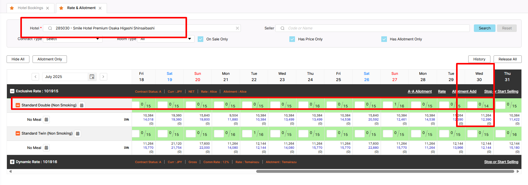 Change Exclusive Rate allotment 285030 - Smile Hotel Premium Osaka Higashi Shinsaibashi ( Standard Double Non-Smoking) for July 30, 2025: 0/15 = > 0/14