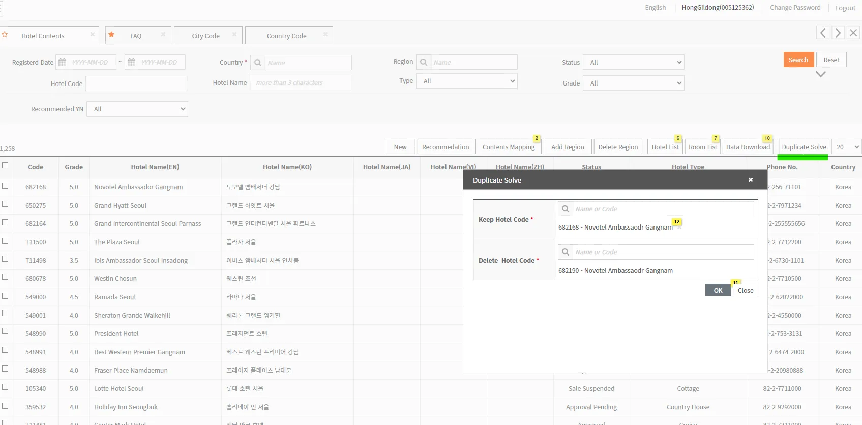 - 2개 호텔코드 중에서, 컨텐츠를 유지할 호텔과, 컨텐츠에서 삭제할 호텔 코드를 입력 받는다.