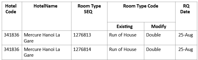 Please kindly assist to change the Room type Code of 341836 - Mercure Hanoi La Gare as below: