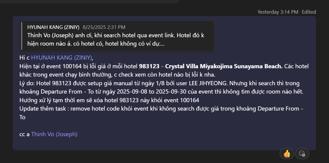 Description: Some hotels in the event has a price issue and shows no available rooms for certain travel dates. Remove this hotel from the event for now. Create a way to automatically remove any hotel from the event if it has no prices for the selected dates.