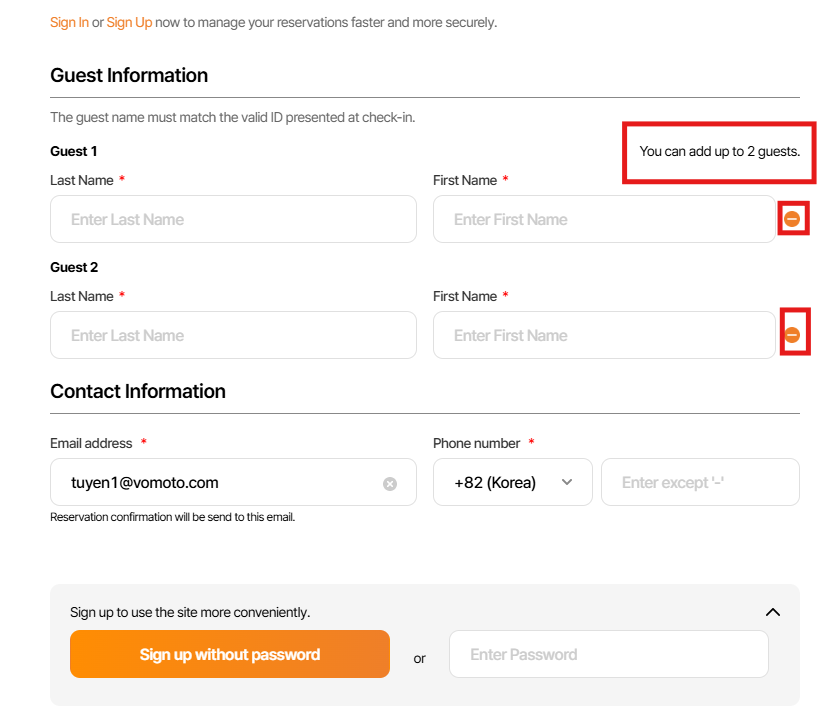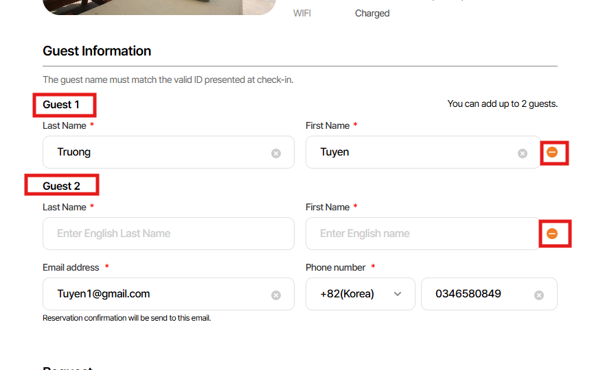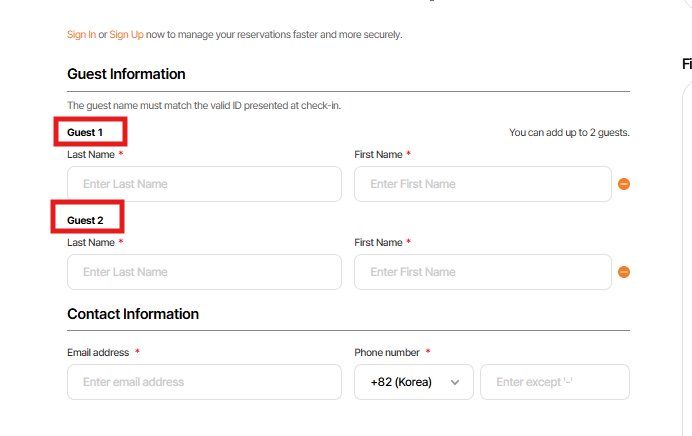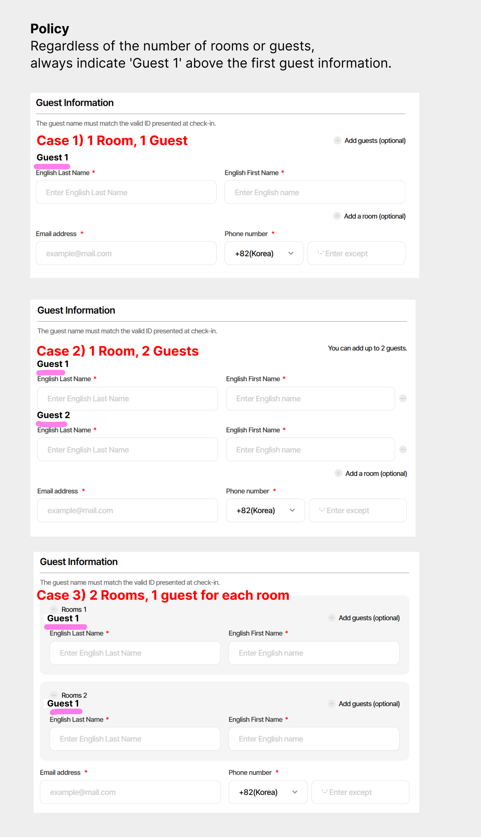 Regardless of the number of rooms or guests, always indicate 'Guest 1' above the first guest information.