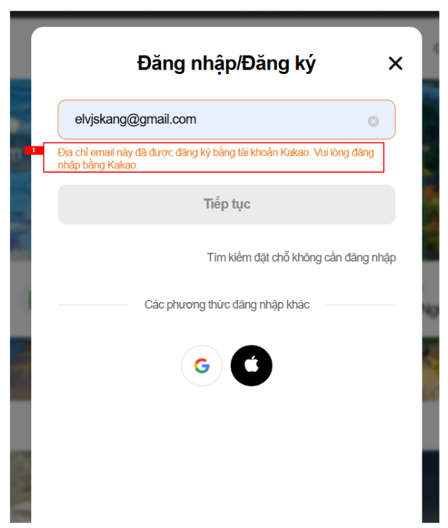 → “Email này đã đăng ký bằng Kakao/Naver. Vui lòng đổi ngôn ngữ sang tiếng Hàn và đăng nhập bằng Kakao/Naver.”