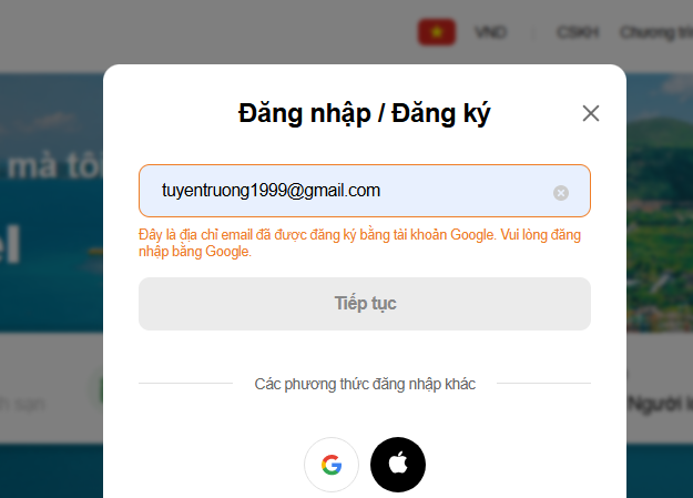 System: Địa chỉ email này đã được đăng ký bằng tài khoản Google. Vui lòng đăng nhập bằng Google.