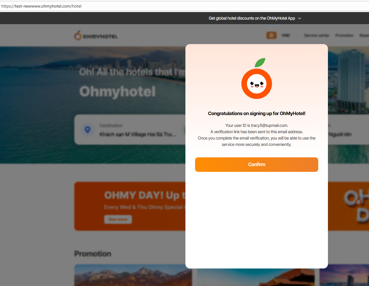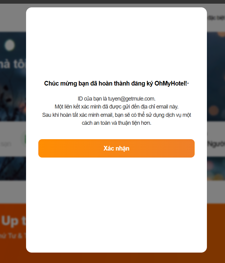 To-be: Chúc mừng bạn đã đăng ký thành công Ohmyhotel!