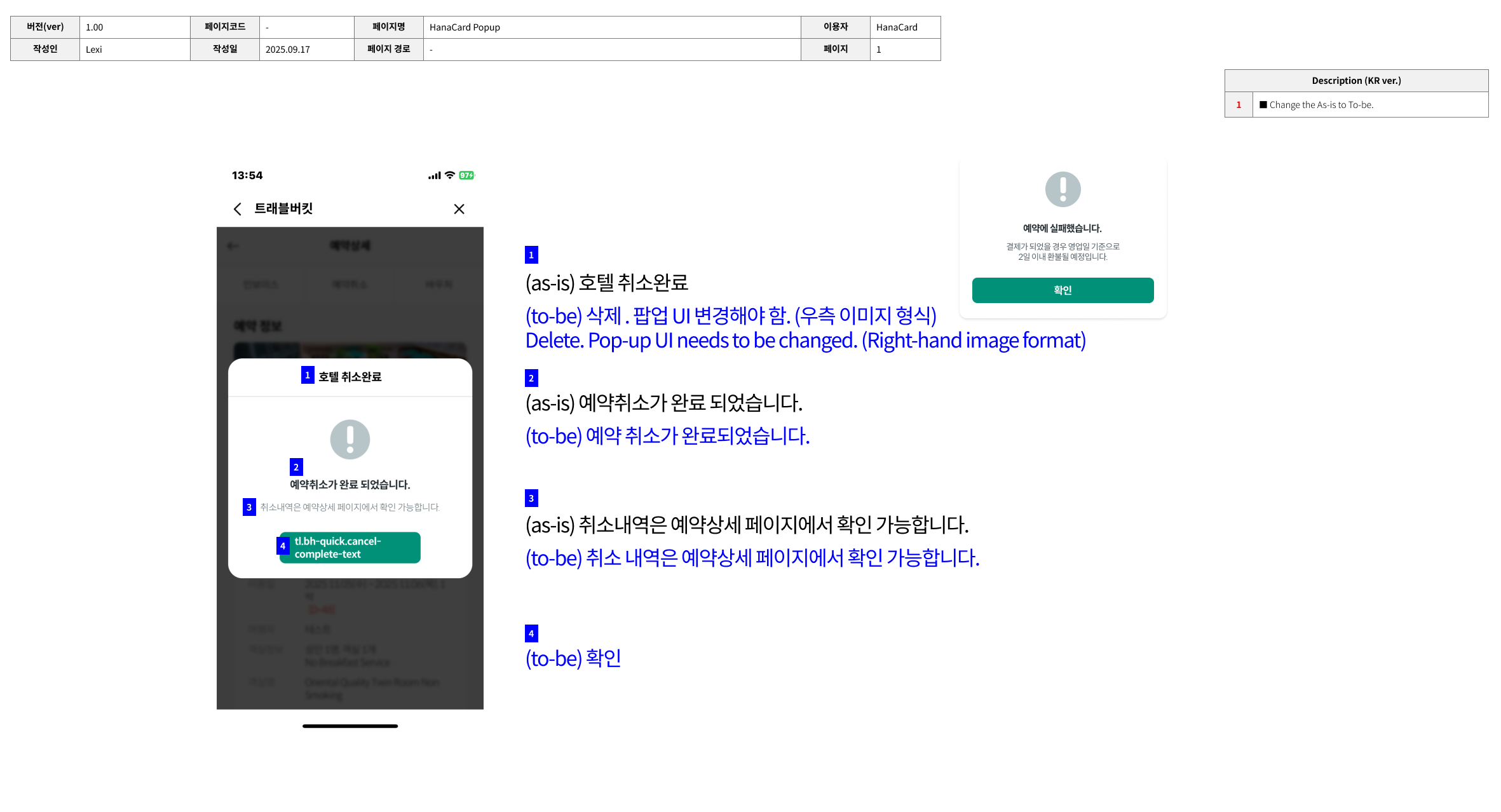 하나카드 앱에서 취소 시 노출되는 alert이므로, 빠르게 진행되면 좋을 것 같습니다.