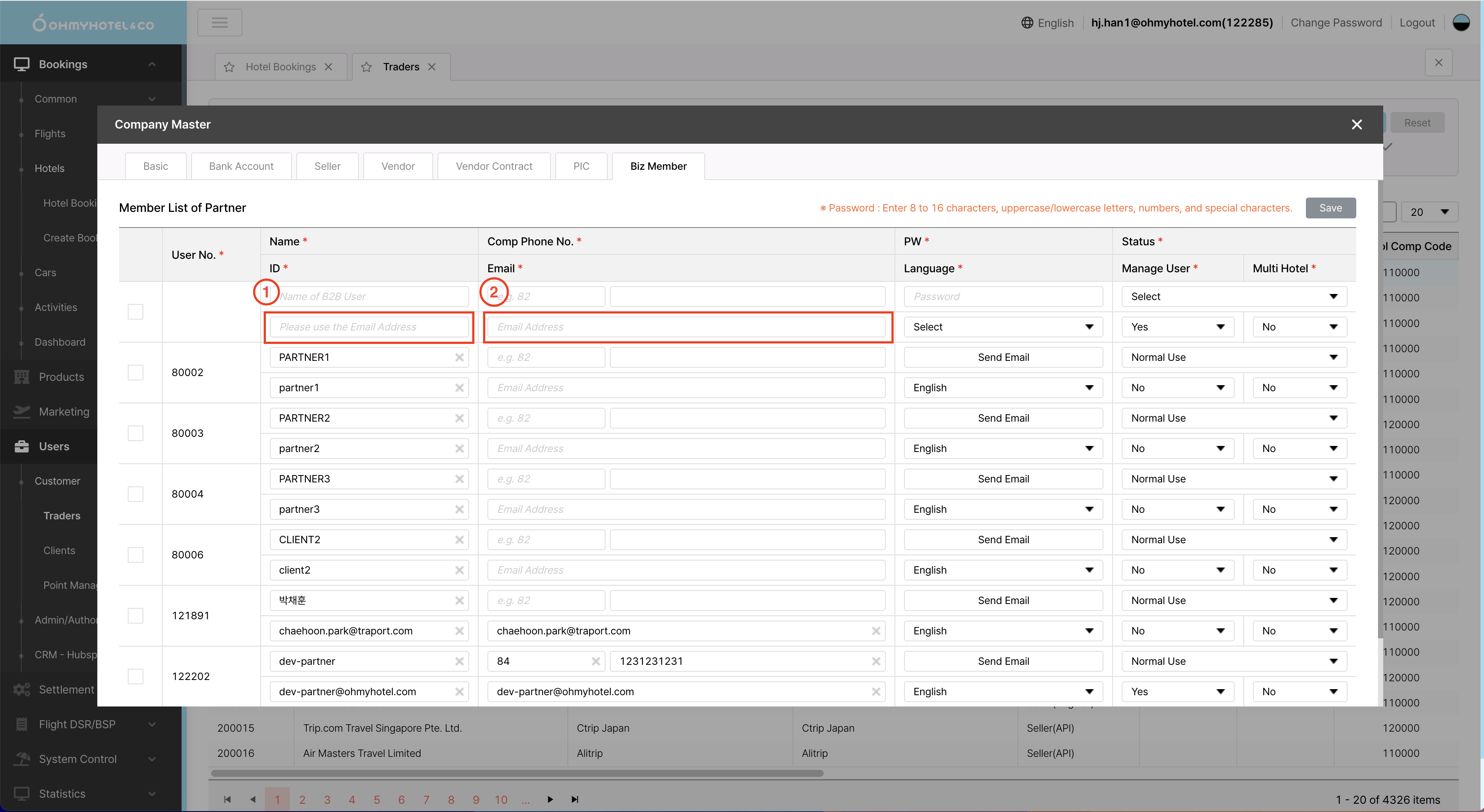 2. Users > Customer > Traders > (Comp detail) modal ‘Company Master’ > Biz Member