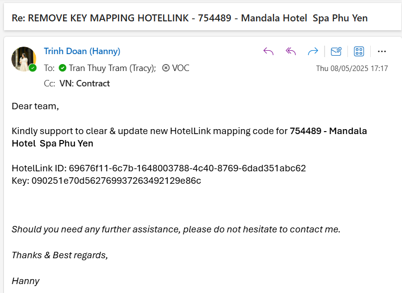 [VOC]HIGH: REMOVE KEY MAPPING HOTELLINK - 754489 - Mandala Hotel Spa Phu Yen