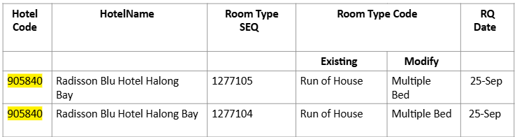 Please kindly assist to change the Room type Code of 905840 - Radisson Blu Hotel Halong Bay as below: