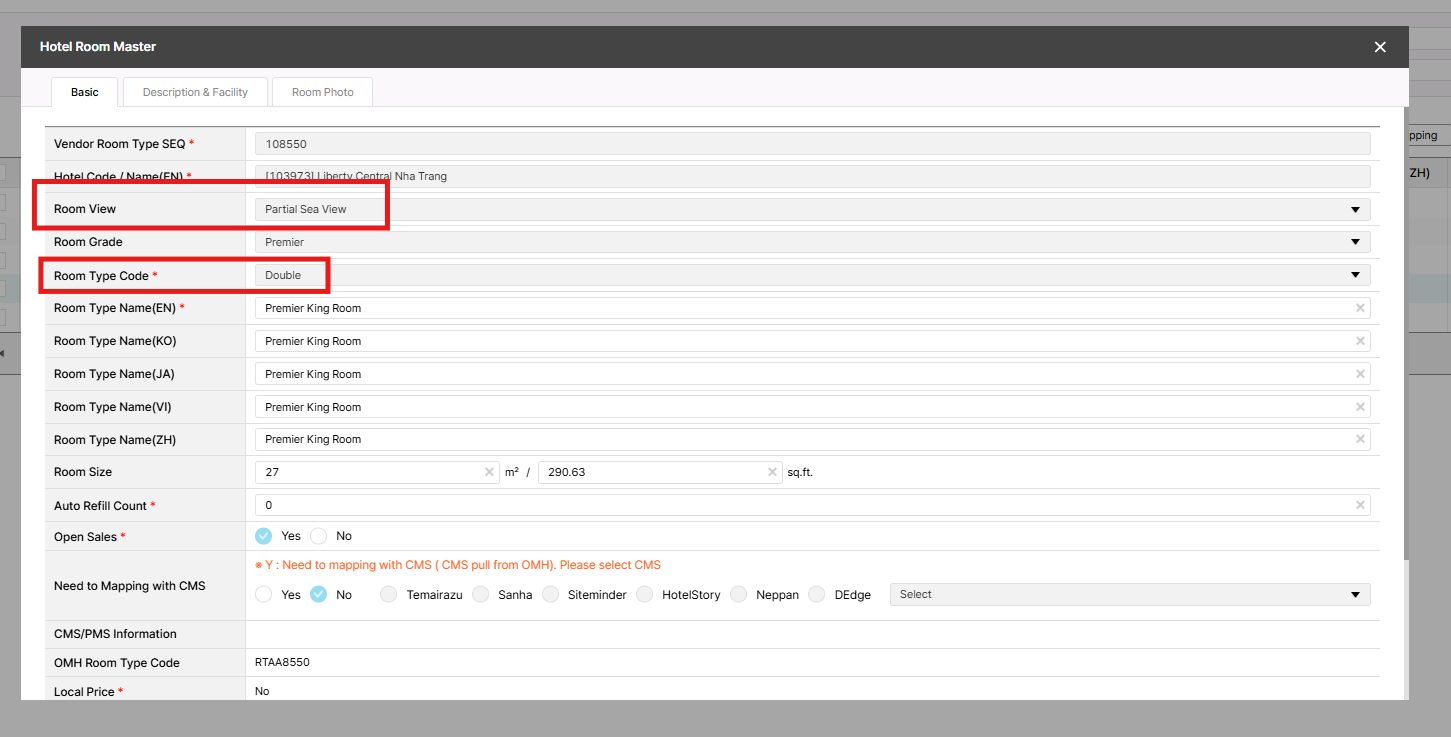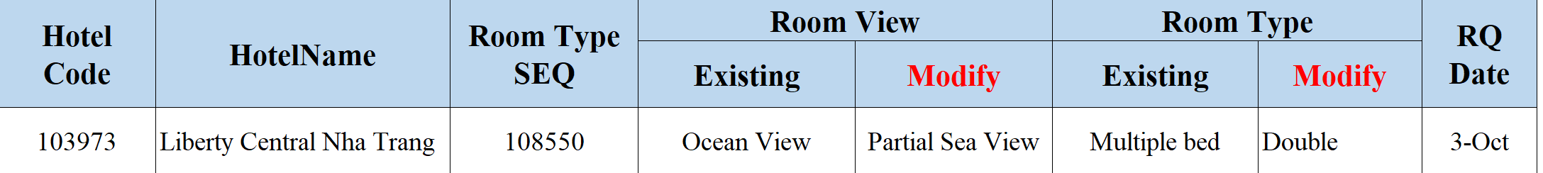 Kindly assist VNSCM team to change the ROOM VIEW + ROOM TYPE of 103973 - Liberty Central Nha Trang as below: