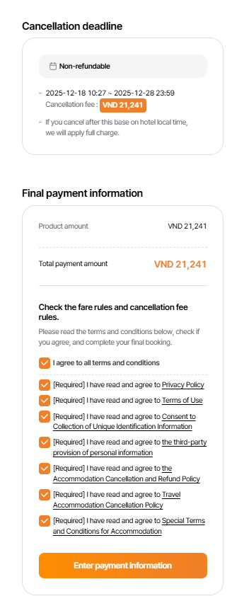 And I already round down for the search & cancellation policy all there follow the search rooms price, mean when you search room are "VND 222,153" then max cancellation policy and total price are the same too
