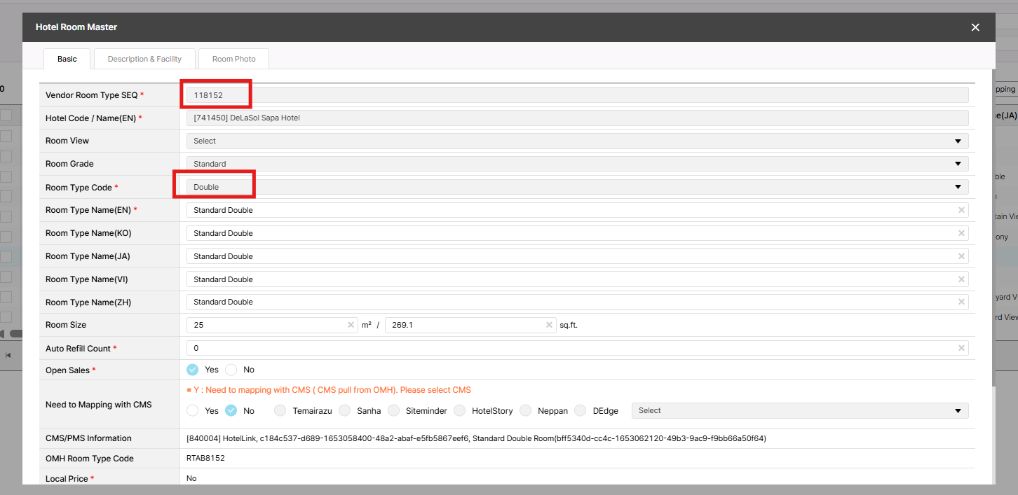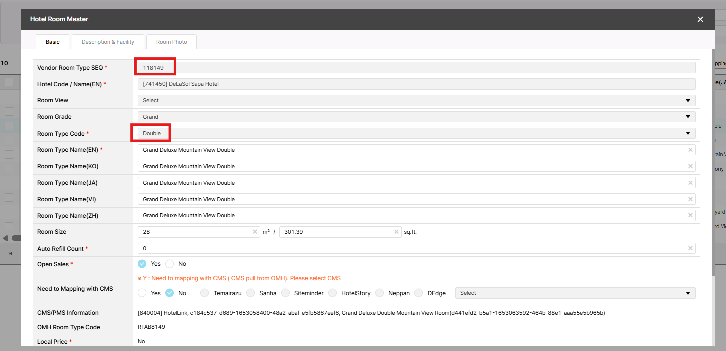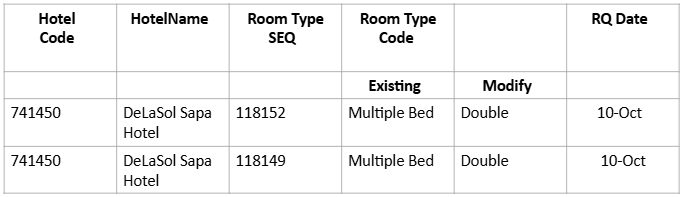 Please kindly assist to change the Room type Code of 741450 - DeLaSol Sapa Hotel as below: