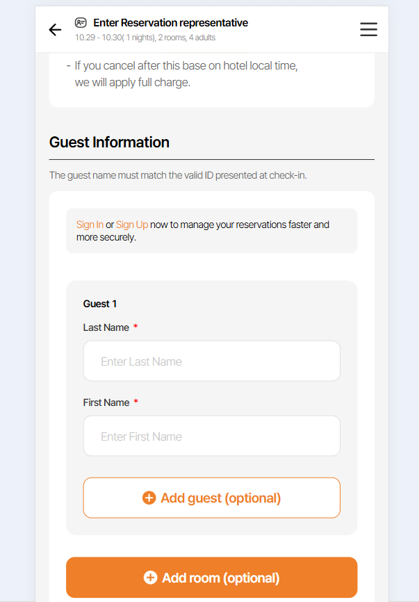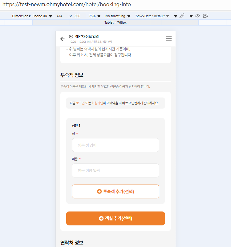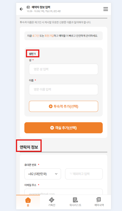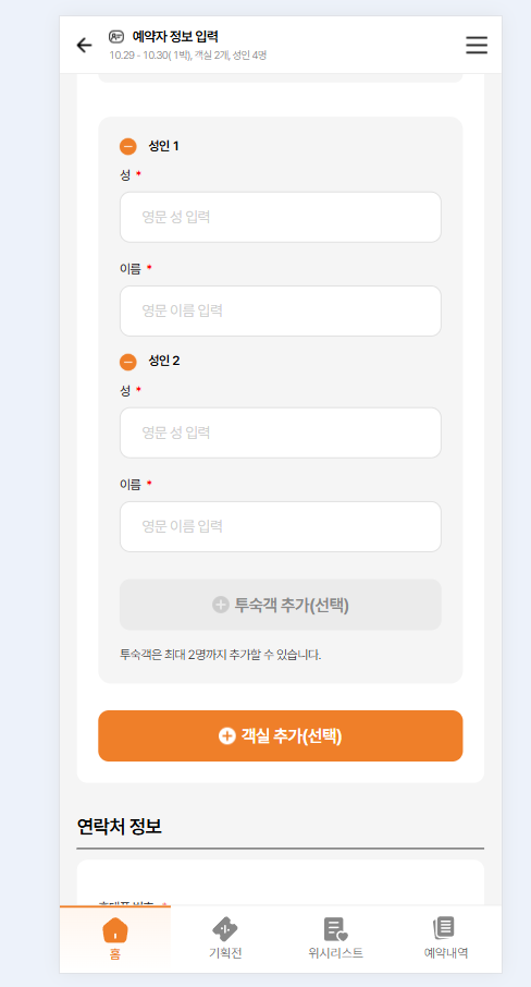 1: Change "성인 1" to "투숙객 이름 1"