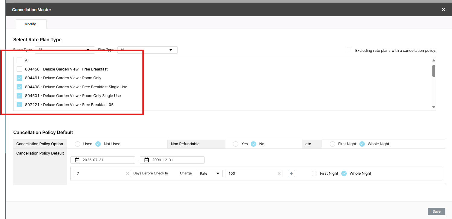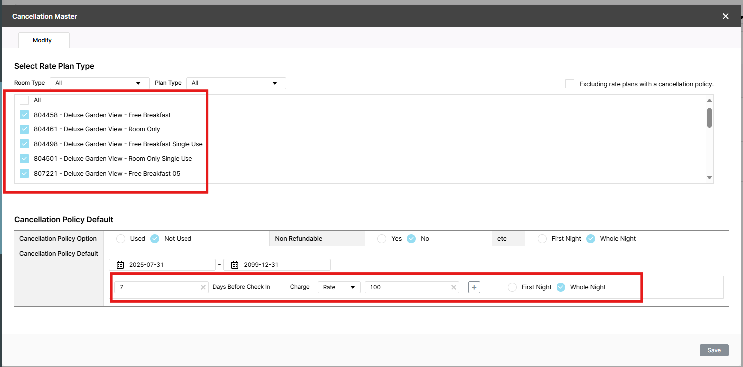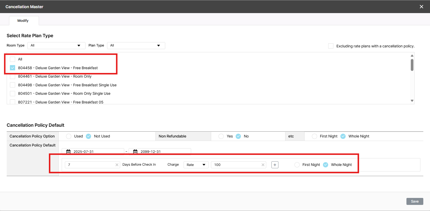 1/ In CXL 7 days prior: 100.0% charge, add more 4 room type to use this policy, unstick 804458 - Deluxe Garden View - Free Breakfast => after save, 5 rate plan are sticked, ok