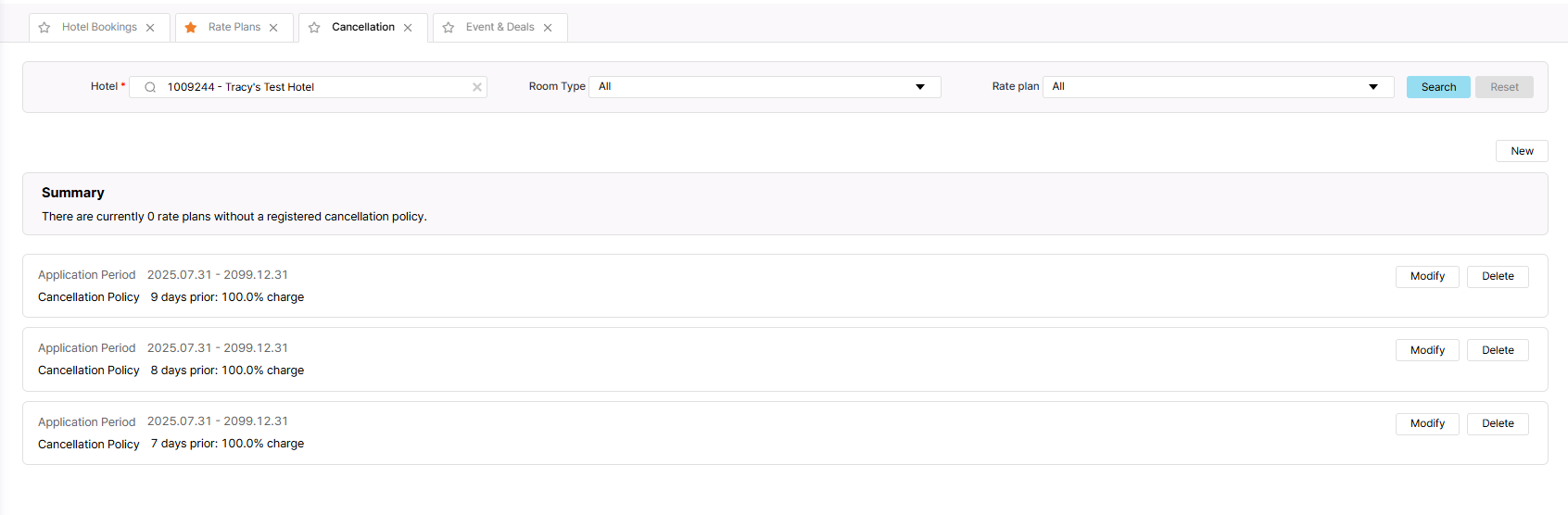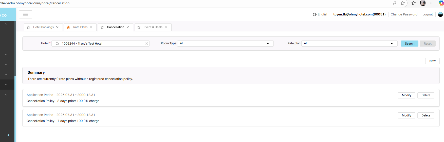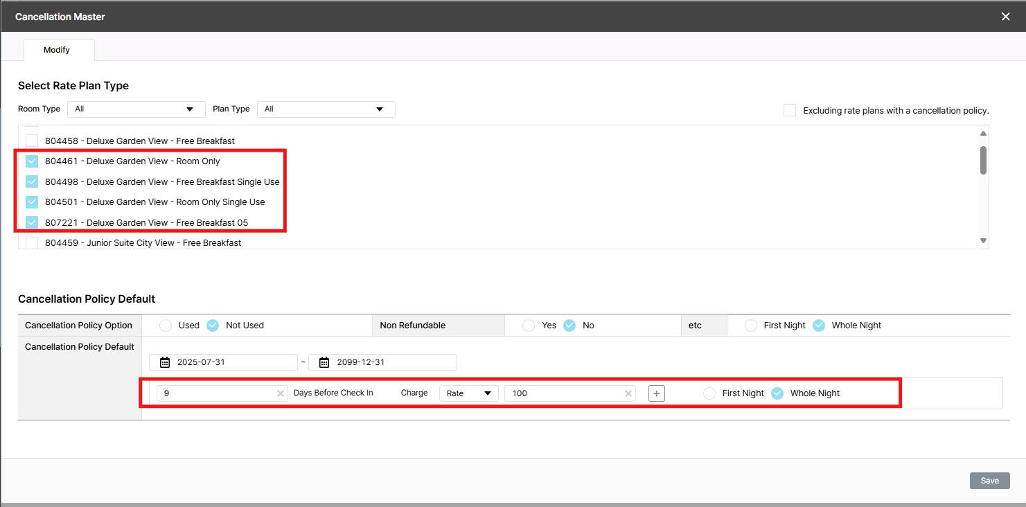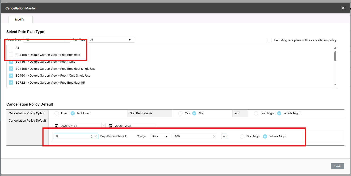 1/ In CXL 7 days prior: 100.0% charge, add more 4 room type to use this policy, unstick 804458 - Deluxe Garden View - Free Breakfast => after save, 5 rate plan are sticked, ok