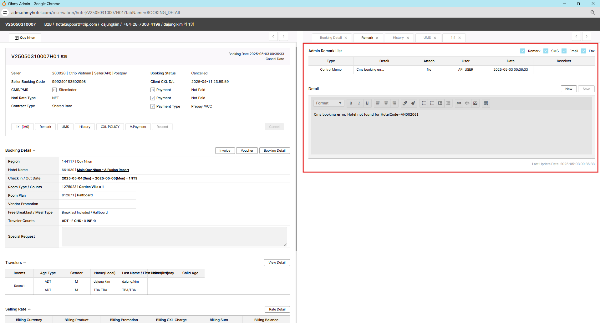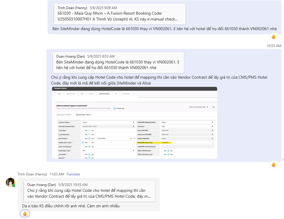A Thinh Vo (Joseph) ơi, KS này e manual check detail thấy các cancelled booking này bị fail do báo lỗi "Cms booking error, Hotel not found for HotelCode=VN002061". KS báo vẫn mapping với SiteMinder bình thường bữa giờ. Nhờ team check giúp em booking fail do đâu với ạ