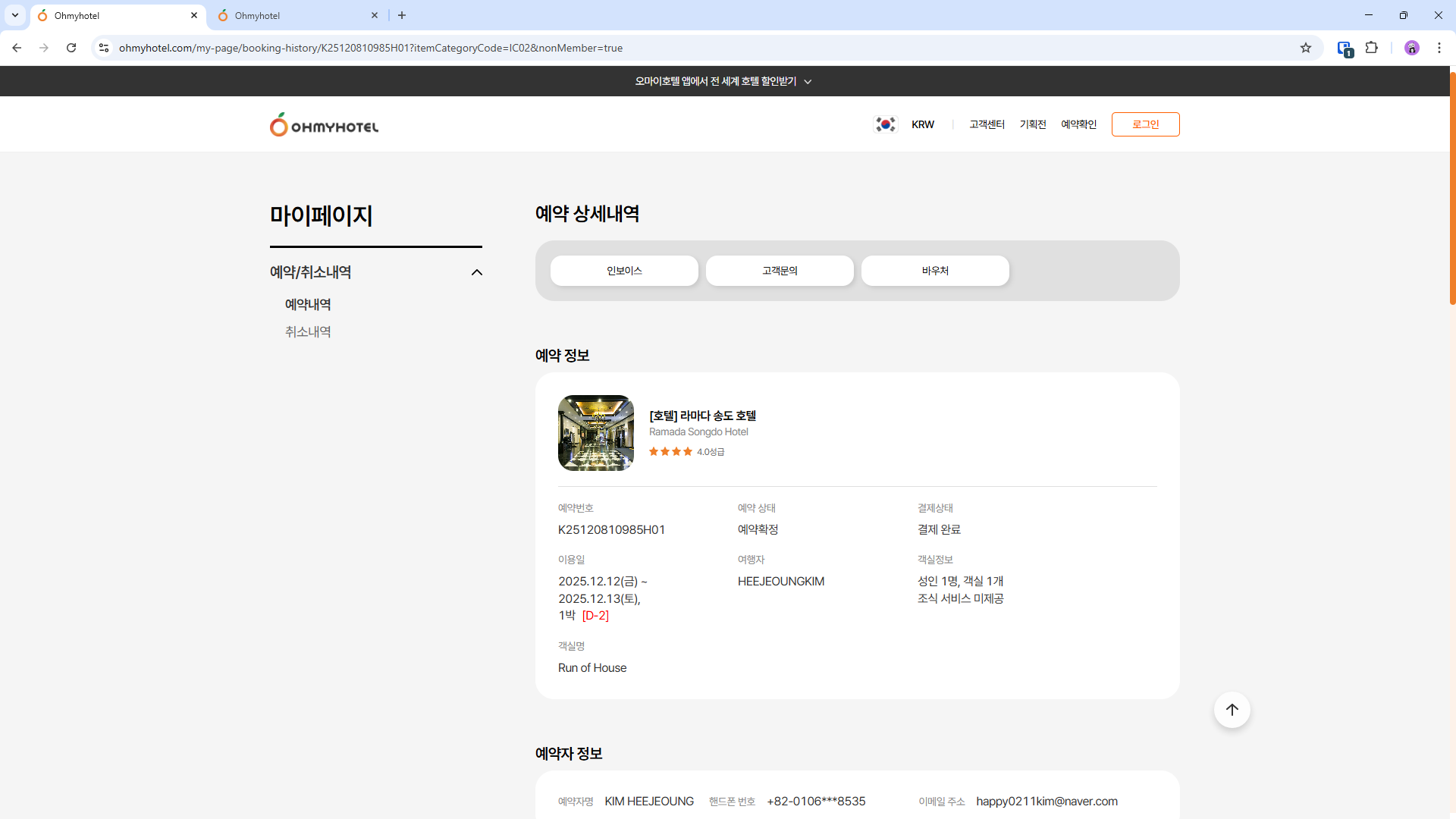 - Nếu trạng thái đặt chỗ là “đã đặt” → tên trang hiển thị là “예약 상세내역”