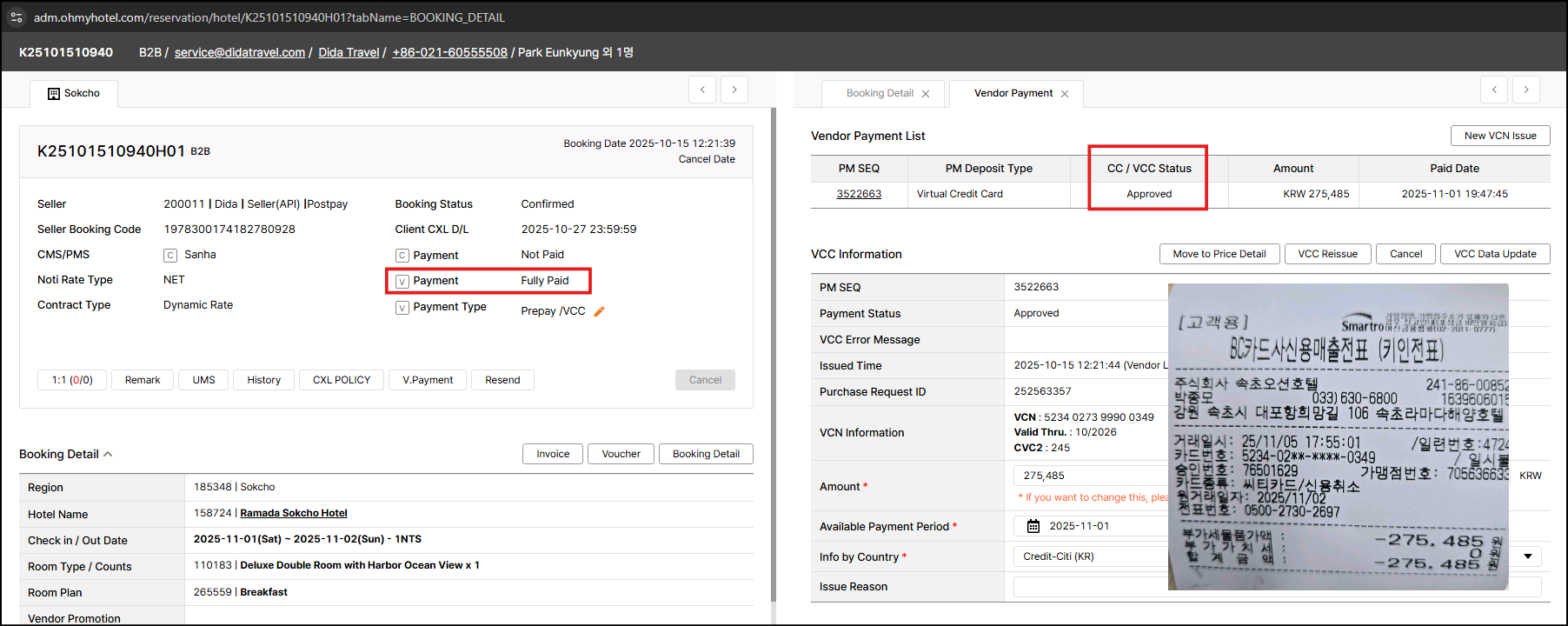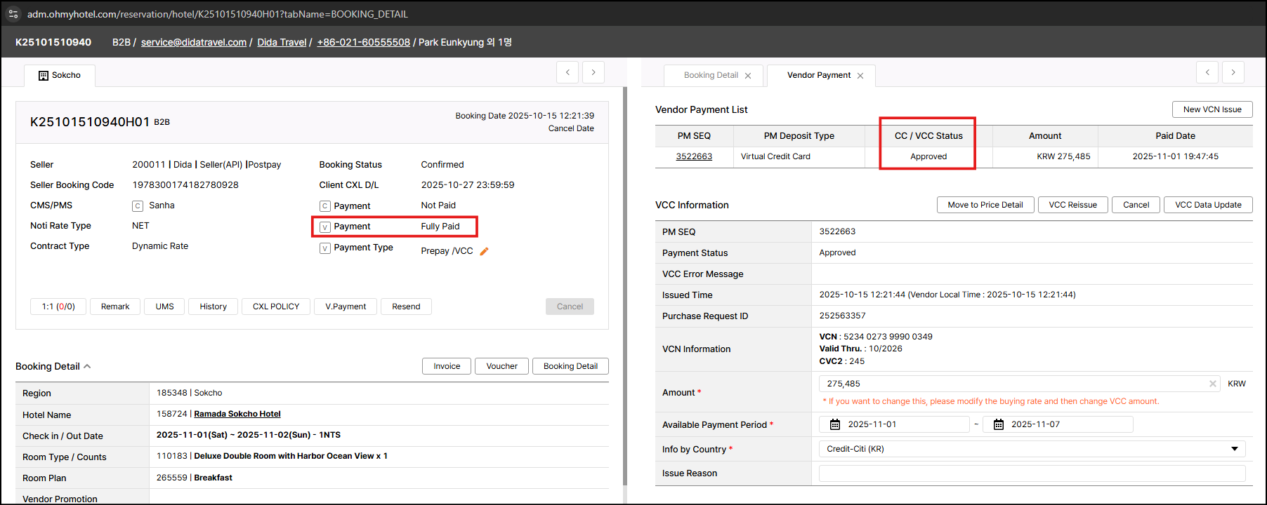 Hotel charged and cancelled this VCC payment as payment amount should be changed.