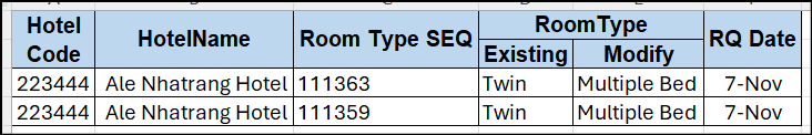 Please kindly assist to change the Room type Code of 223444 - Ale Nhatrang Hotel as below: