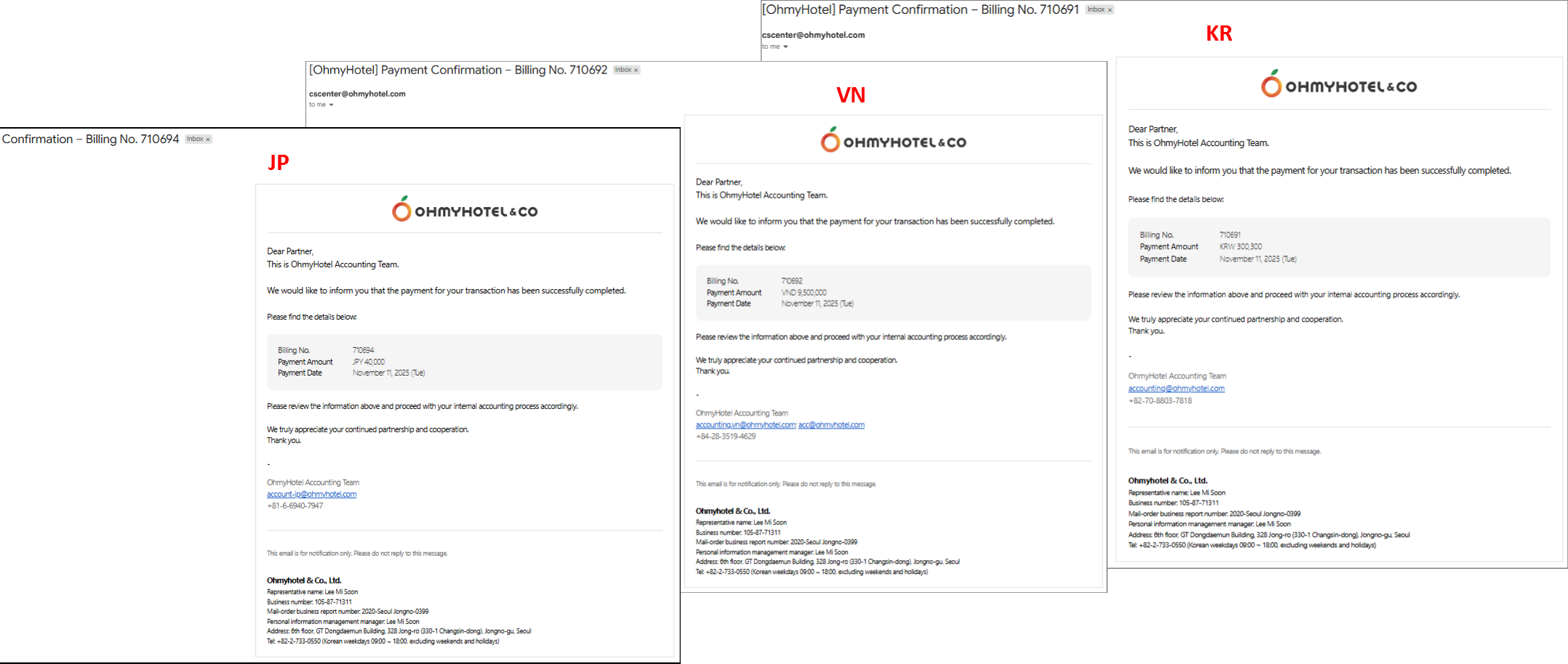 Related to Ellis improvement - 개선(improvement) #2219: [FE] Auto email to hotel sales & accounting upon payment completion완료성공(Resolve)Tan Jang11/10/202511/10/2025