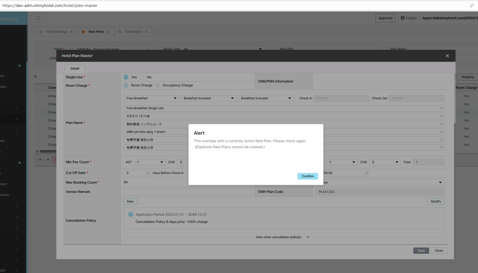 • 현재 활성화된 Rate Plan 과 중복됩니다. 다시 확인해 주세요. <br> (Rate Plan 중복 생성 불가)