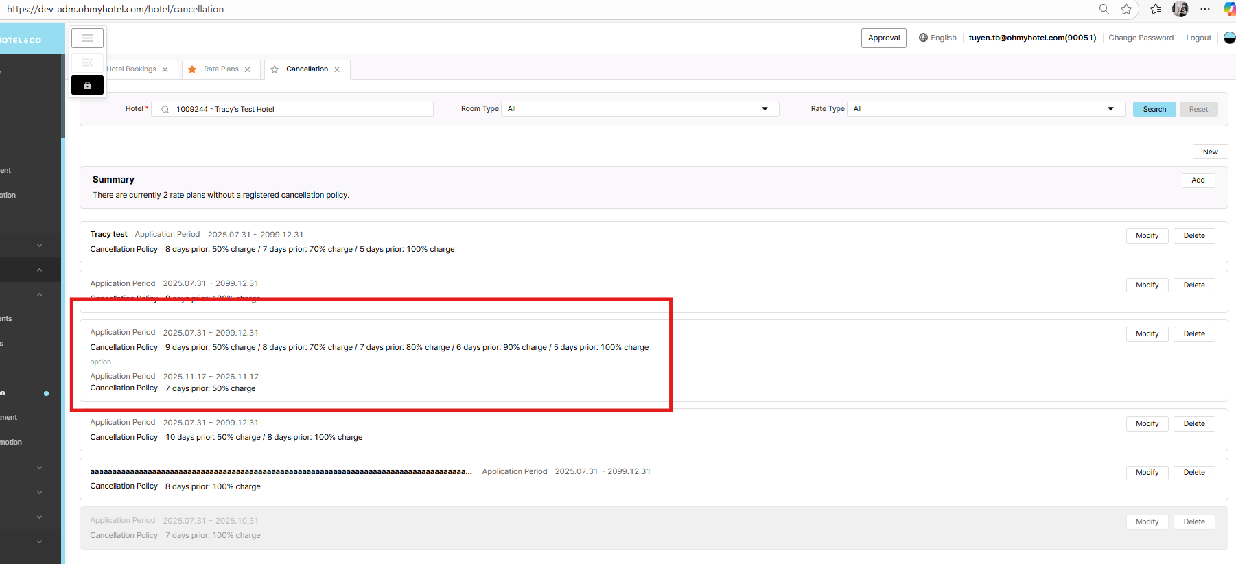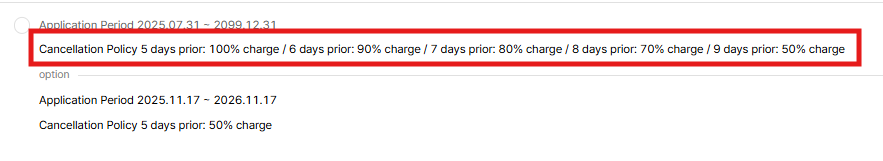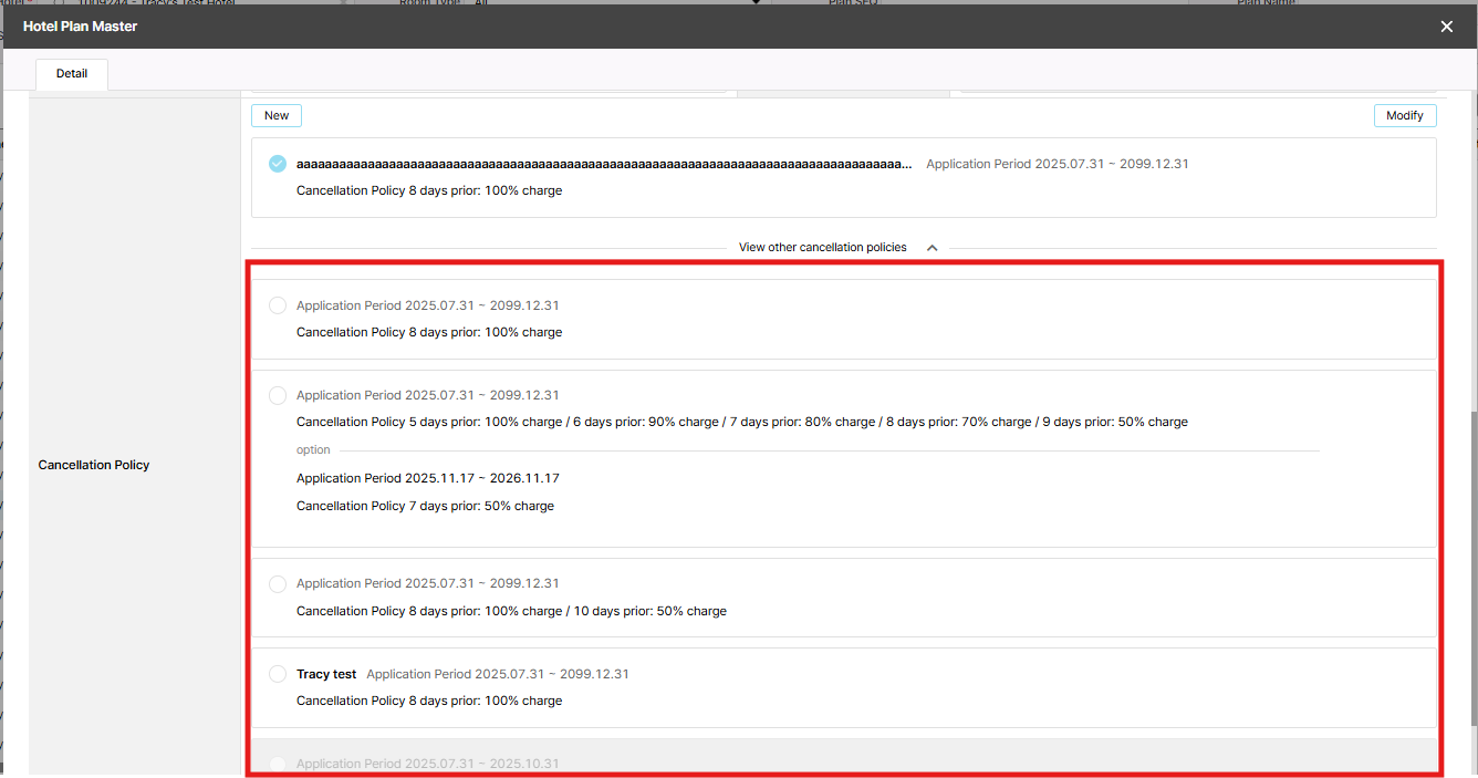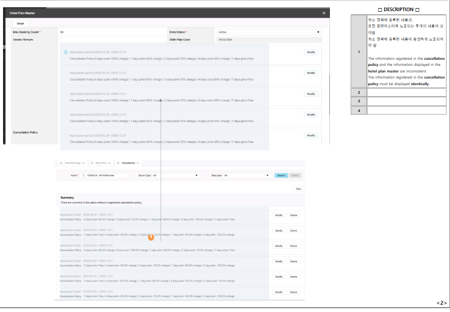 - Nội dung được đăng ký trong chính sách hủy phòng (cancellation policy) và nội dung hiển thị trong hotel plan master đang không đồng nhất.