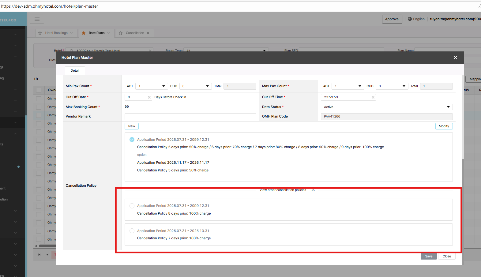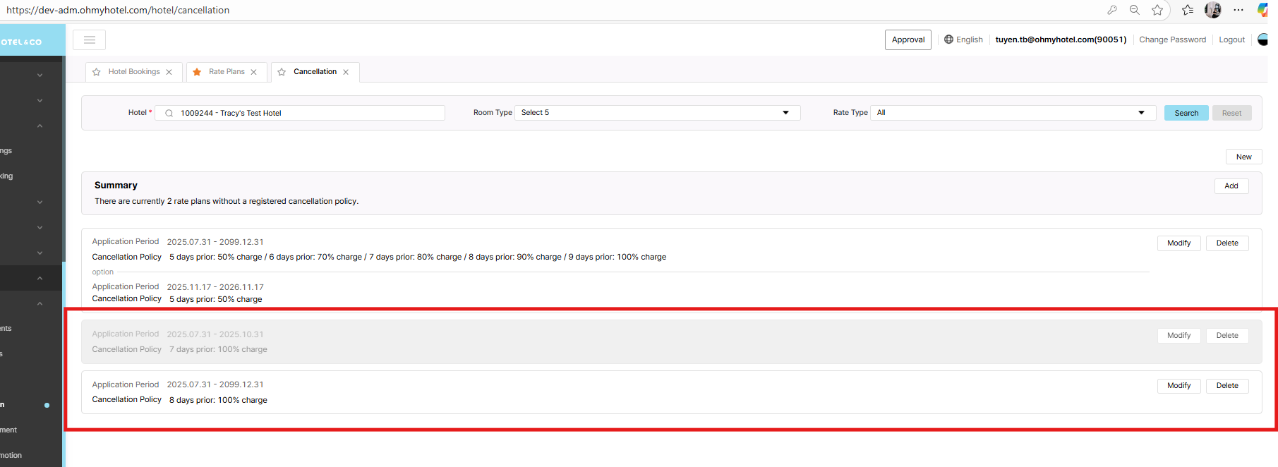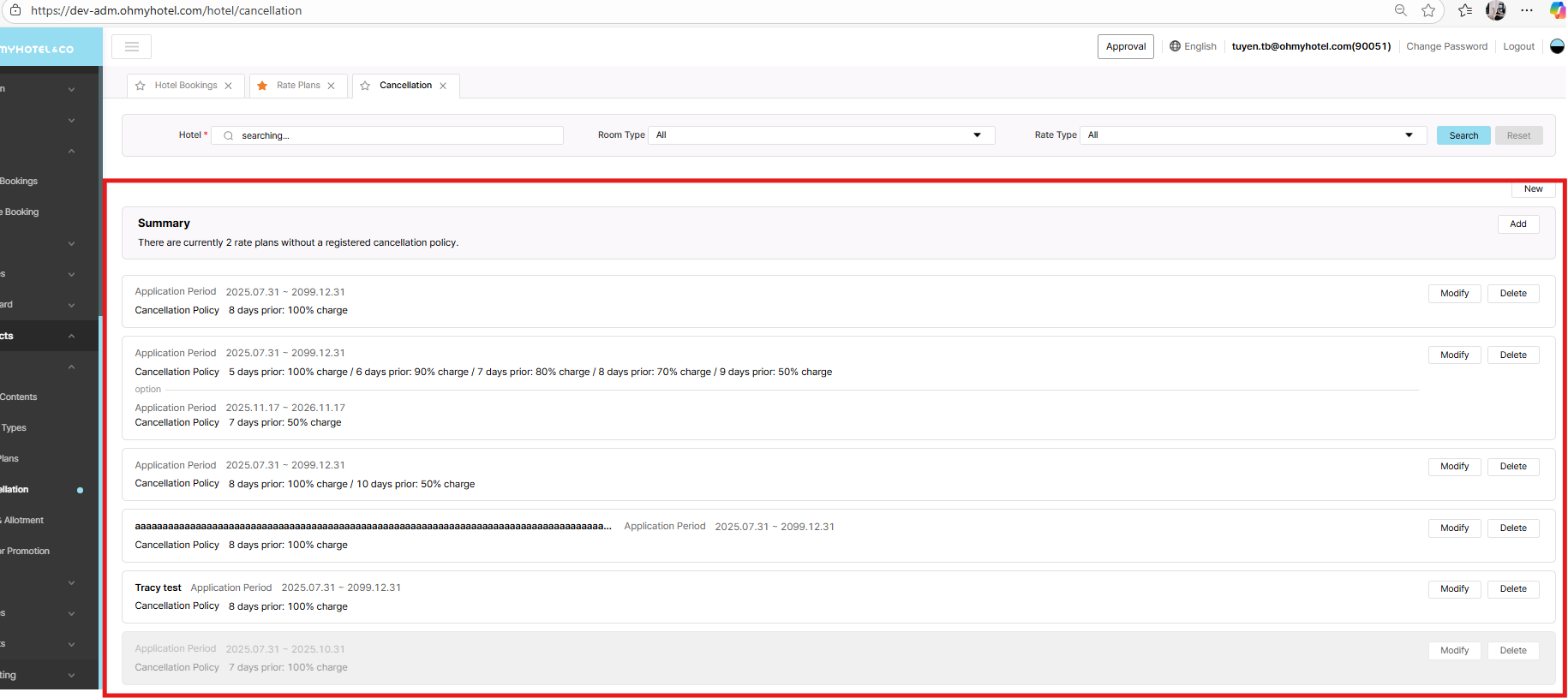 - Nội dung được đăng ký trong chính sách hủy phòng (cancellation policy) và nội dung hiển thị trong hotel plan master đang không đồng nhất.