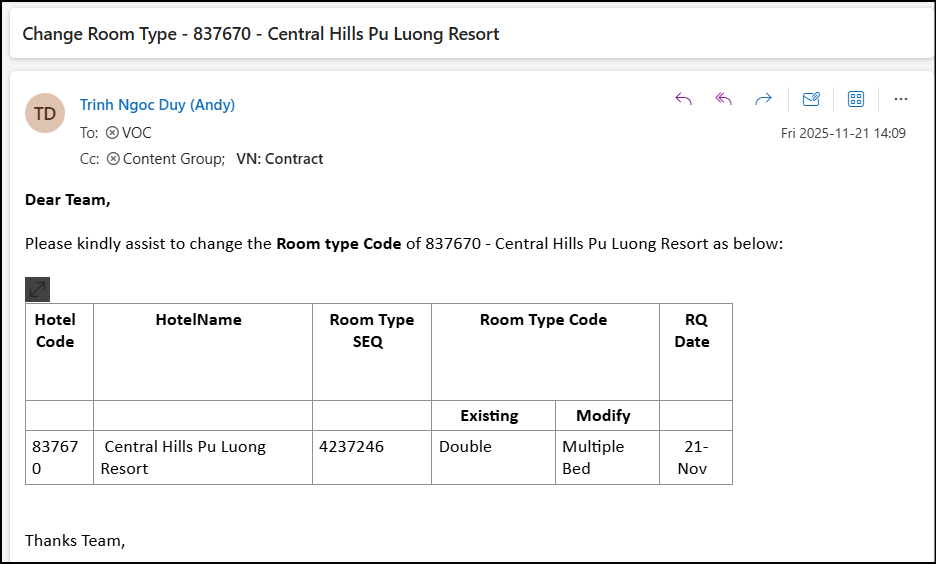Please kindly assist to change the Room type Code of 837670 - Central Hills Pu Luong Resort as below: