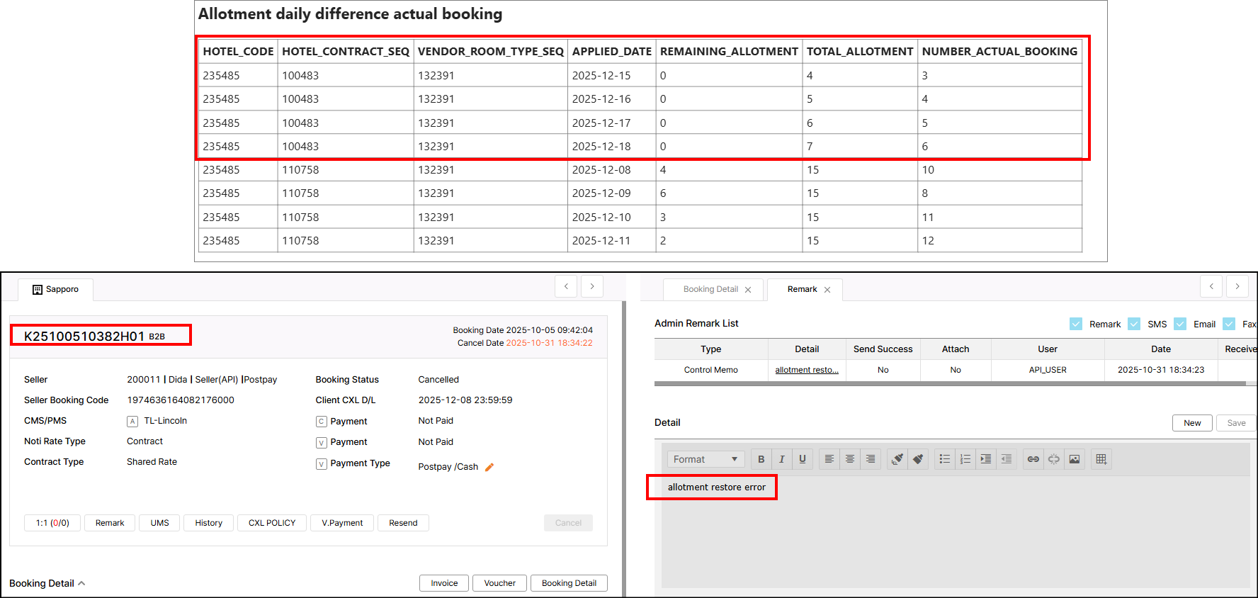 Guest cancelled booking via API. An error recorded on booking detail of Alice as Allotment restore error.