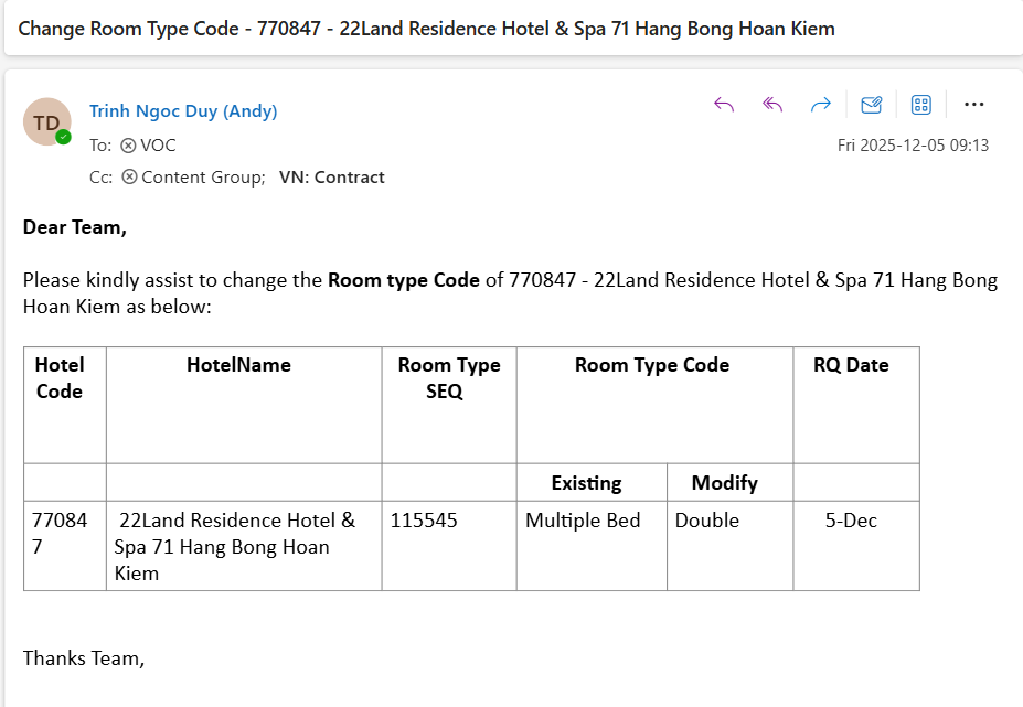 Please kindly assist to change the Room type Code of 770847 - 22Land Residence Hotel & Spa 71 Hang Bong Hoan Kiem as below:
