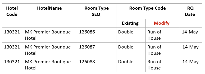 Please kindly assist to change the Room type Code of 130321 - MK Premier Boutique Hotel as below: