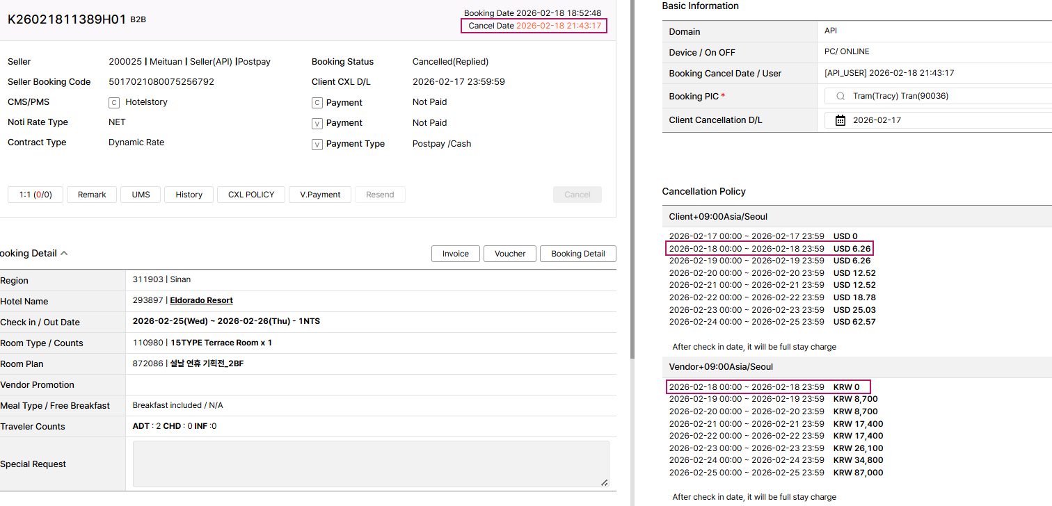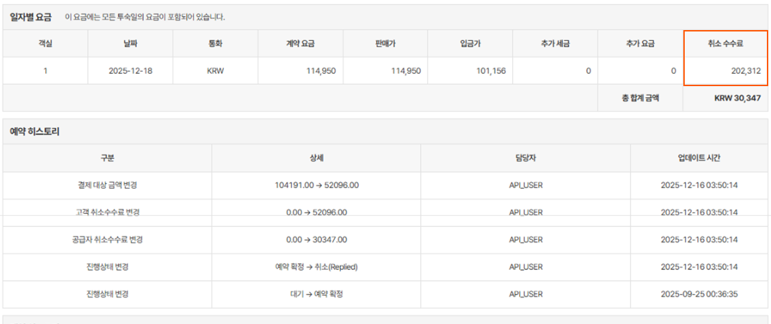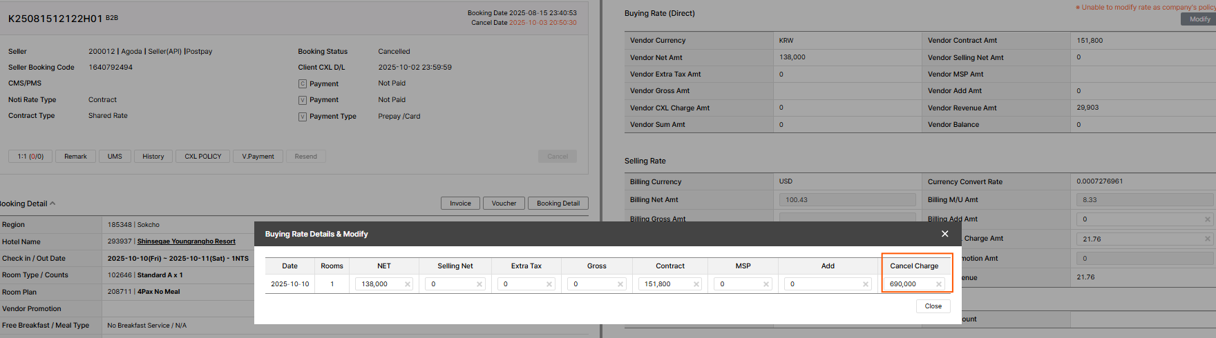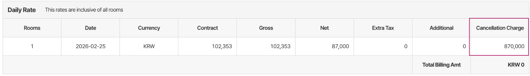 However, the “Cancel Charge” under the buying rate is showing as KRW 870,000, and the same amount is also displayed in the extranet. The hotel is currently inquiring about this discrepancy.