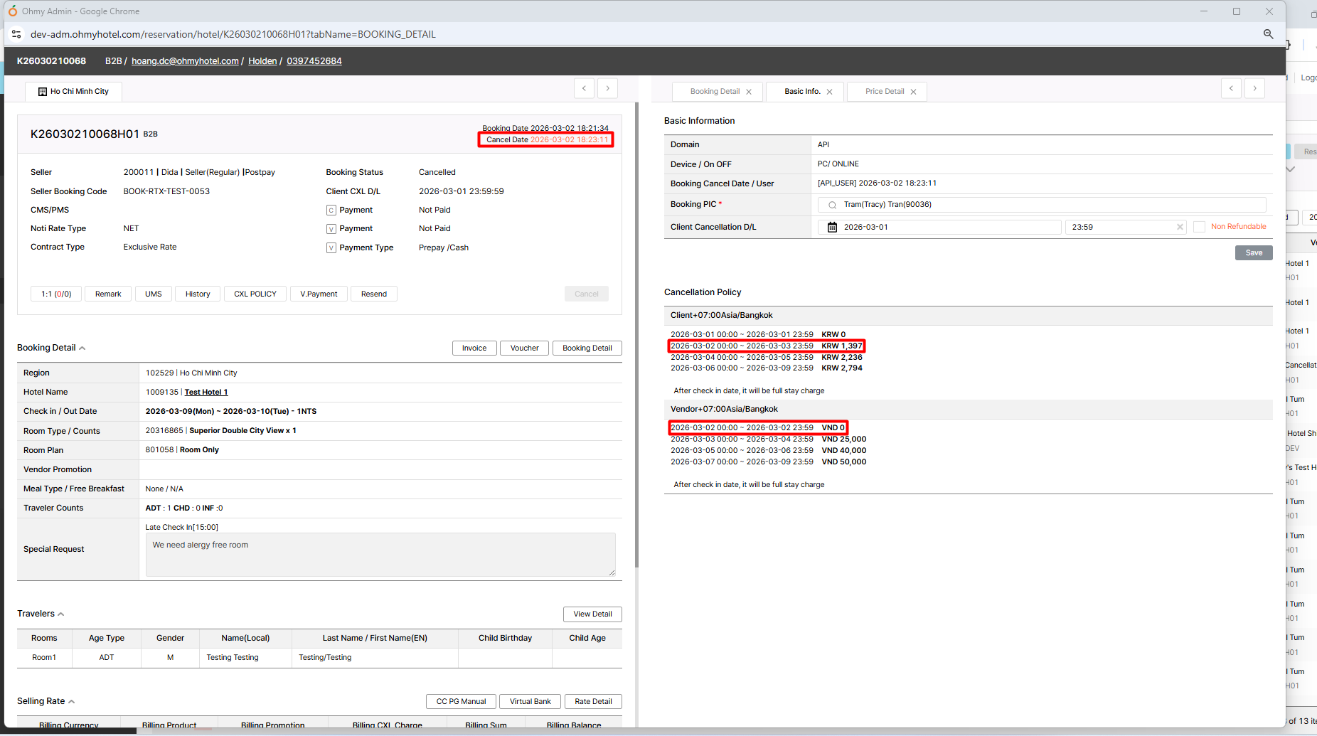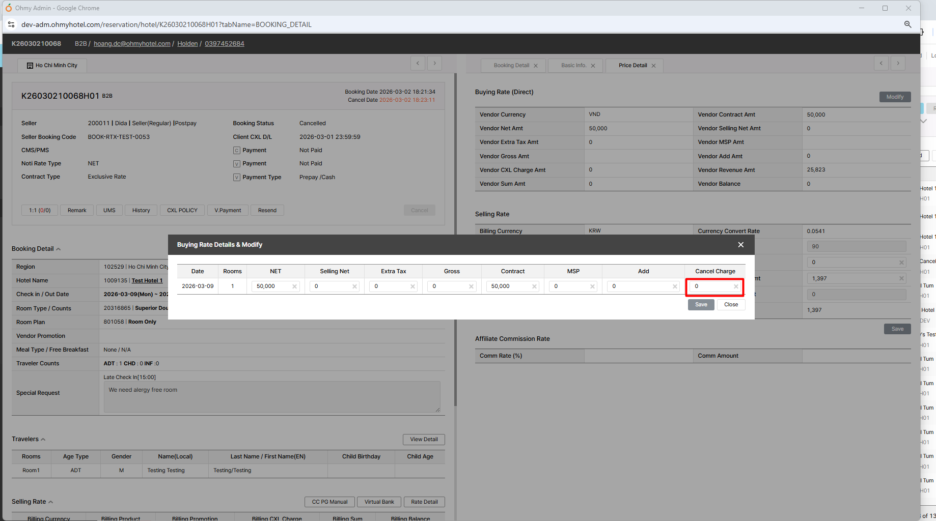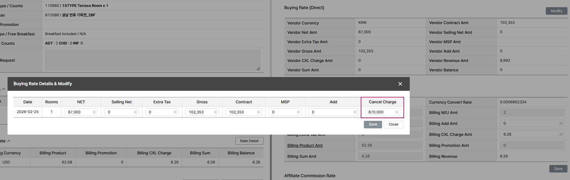 However, the “Cancel Charge” under the buying rate is showing as KRW 870,000, and the same amount is also displayed in the extranet. The hotel is currently inquiring about this discrepancy.