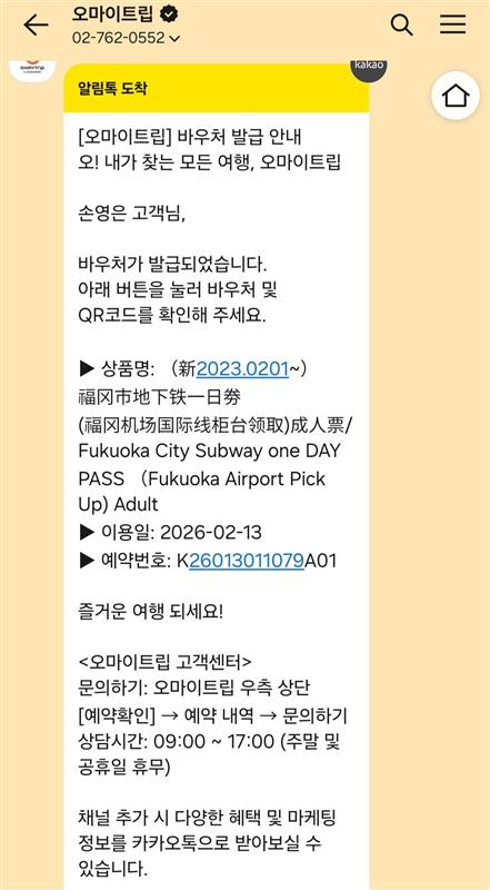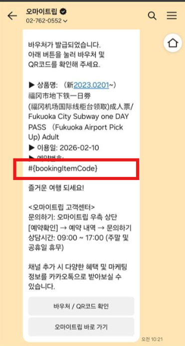 [오마이트립] 바우처 발급 안내\n오! 내가 찾는 모든 여행, 오마이트립\n\n#{user_name} 고객님,\n\n바우처가 발급되었습니다.\n아래 버튼을 눌러 바우처 및 QR코드를 확인해 주세요.\n\n▶ 상품명: #{activity_name}\n▶ 이용일: #{use_date}\n▶ 예약번호: #{bookingItemCode}\n\n즐거운 여행 되세요!\n\n<오마이트립 고객센터>\n문의하기: 오마이트립 우측 상단 [예약확인] → 예약 내역 → 문의하기\n상담시간: 09:00 ~ 17:00 (주말 및 공휴일 휴무)\n\n채널 추가 시 다양한 혜택 및 마케팅 정보를 카카오톡으로 받아보실 수 있습니다.