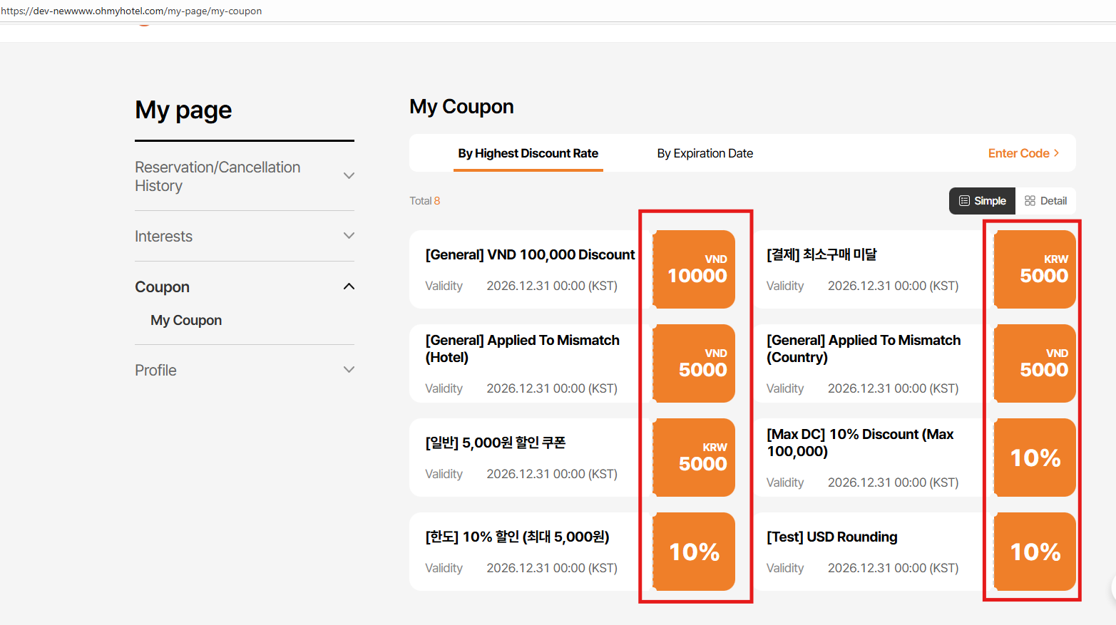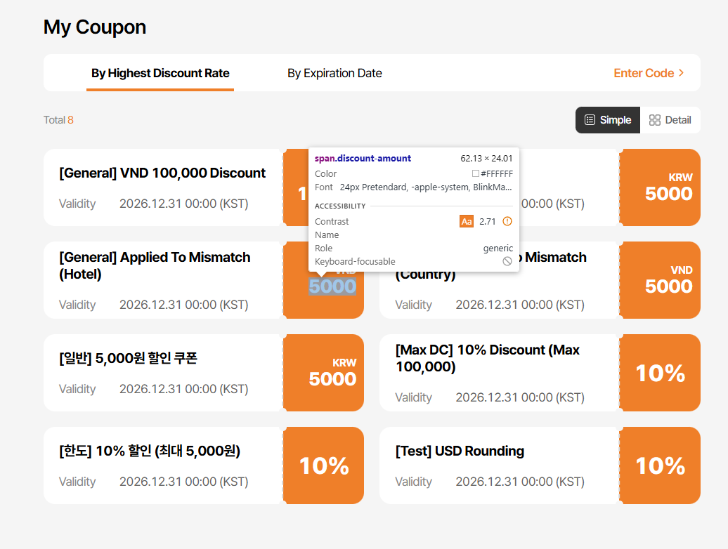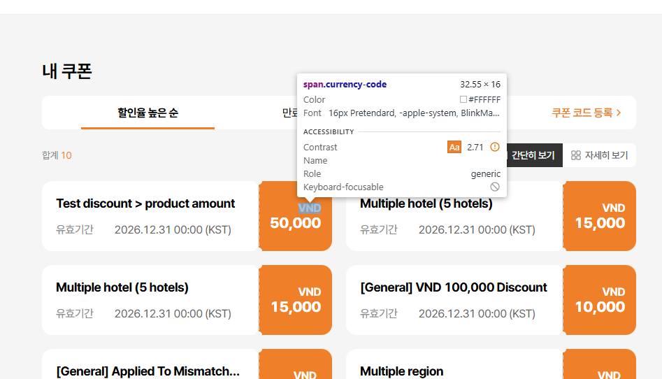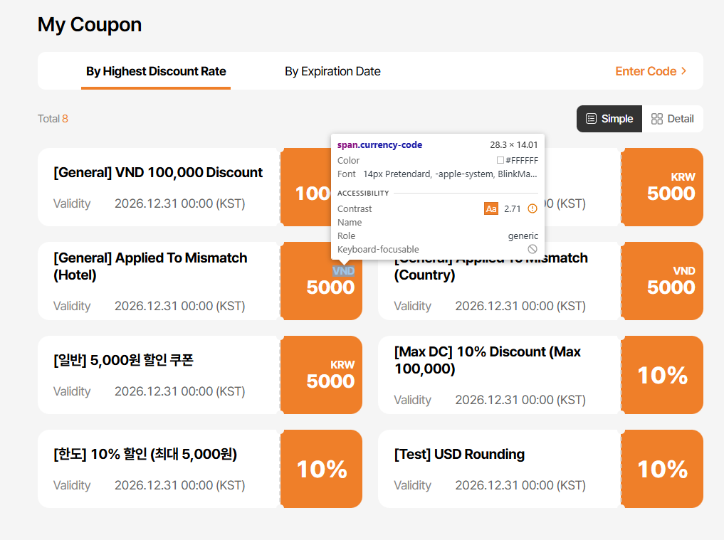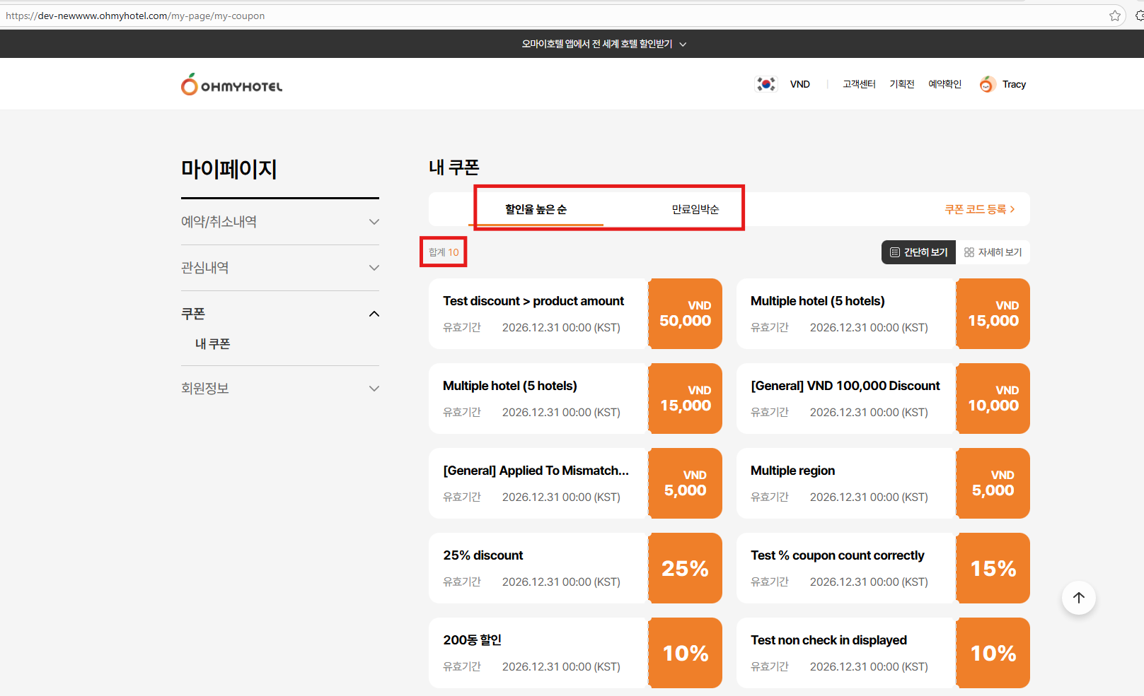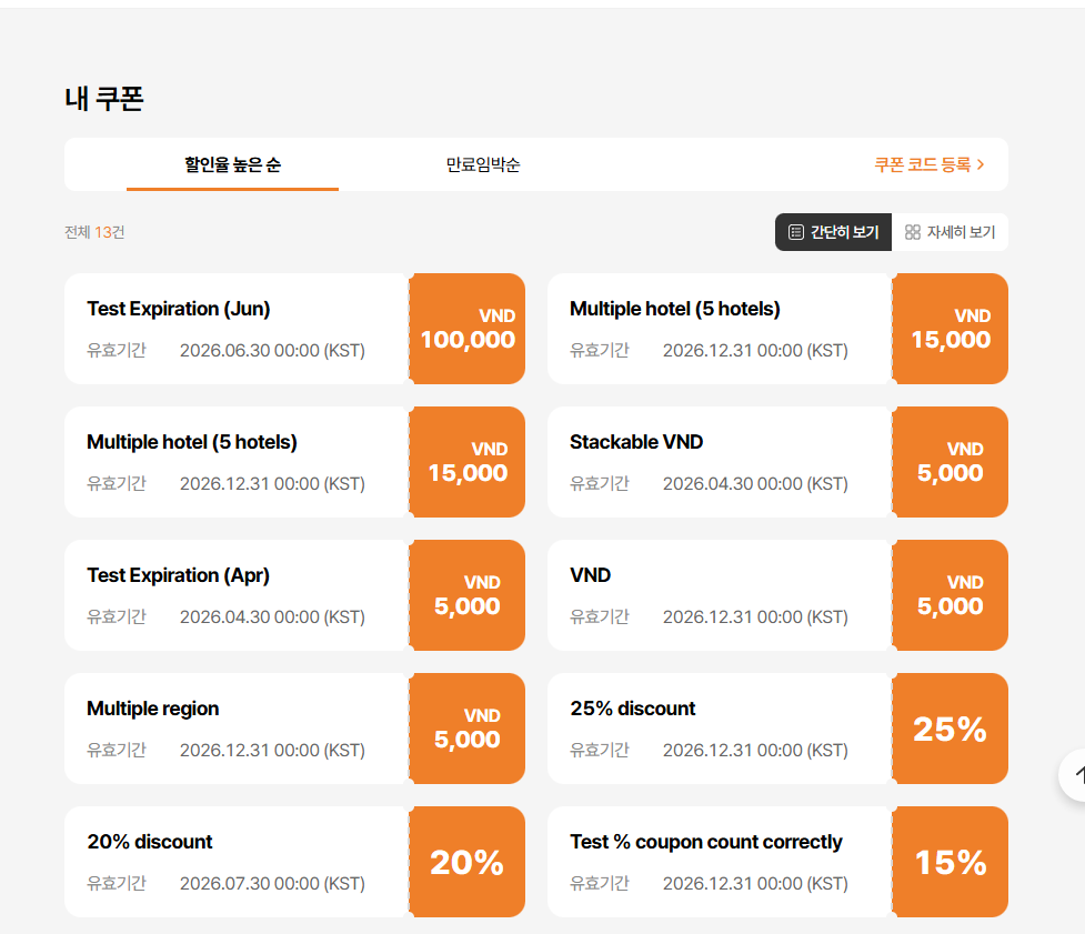 - By Highest Discount Rate text incorrect: Current: 높은 할인율순 / Requirement: 할인율 높은 순 (tl.my-coupon.sort-by-discount) => ok