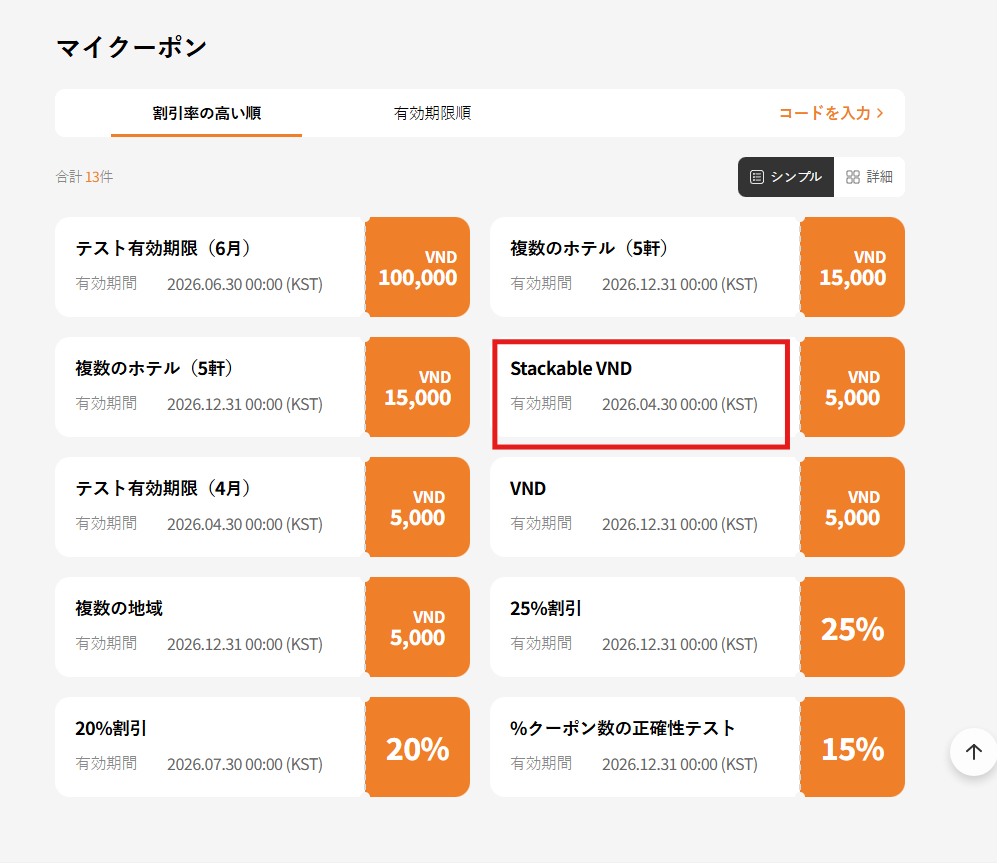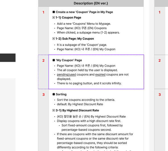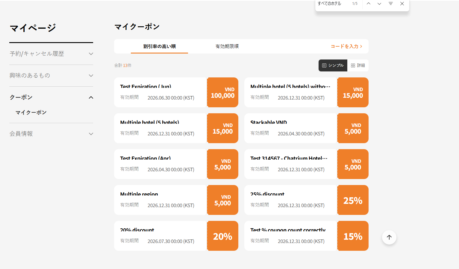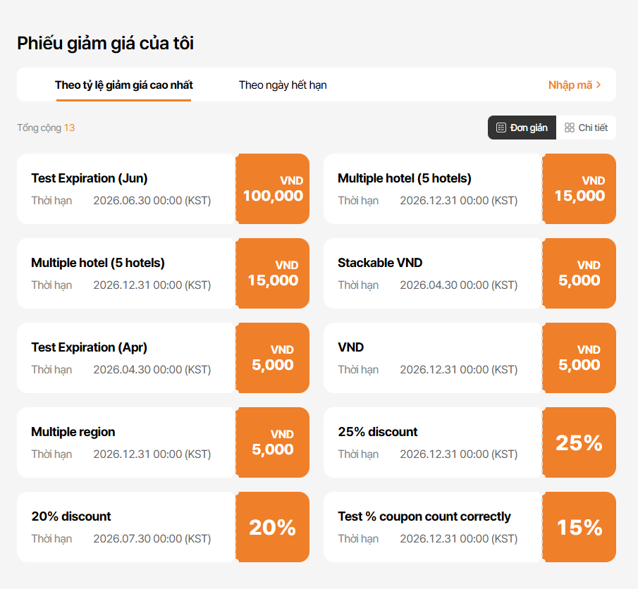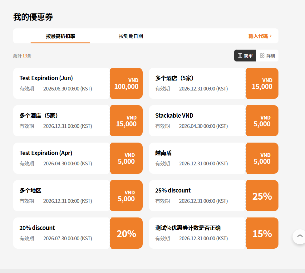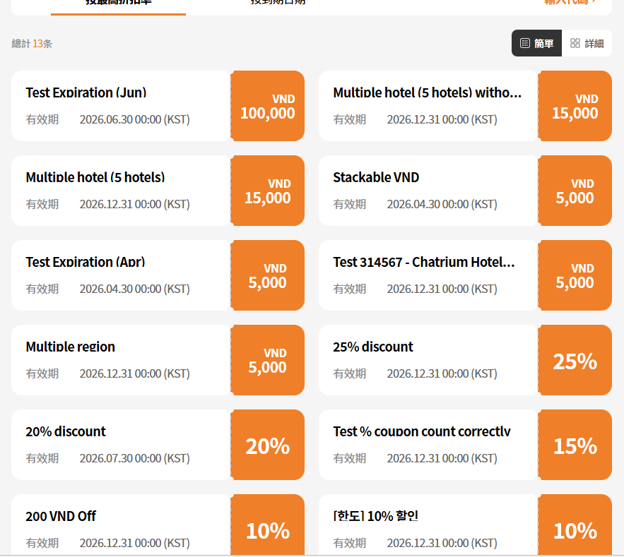 - By Highest Discount Rate text incorrect: Current: 높은 할인율순 / Requirement: 할인율 높은 순 (tl.my-coupon.sort-by-discount) => ok