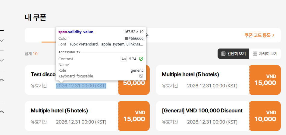 - Simple button text incorrect: Current: 간단히 / Requirement: 간단히 보기 (tl.my-coupon.view-simple)