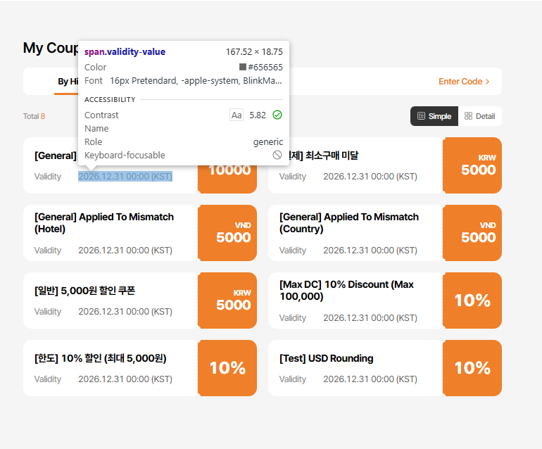 - Simple button text incorrect: Current: 간단히 / Requirement: 간단히 보기 (tl.my-coupon.view-simple) => ok