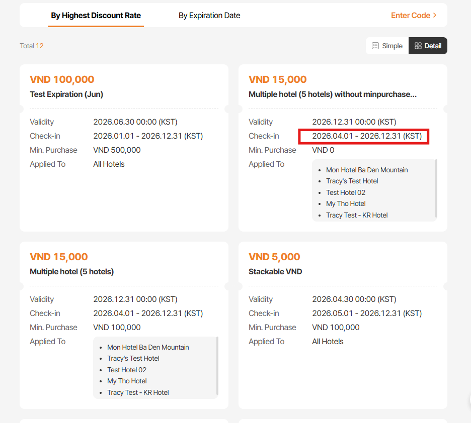 E.g Multiple hotel (5 hotels) coupon - check in date is 1 Apr - 31 Dec 2026 but on Coupon card displayed 1 Jan - 31 Dec 2026