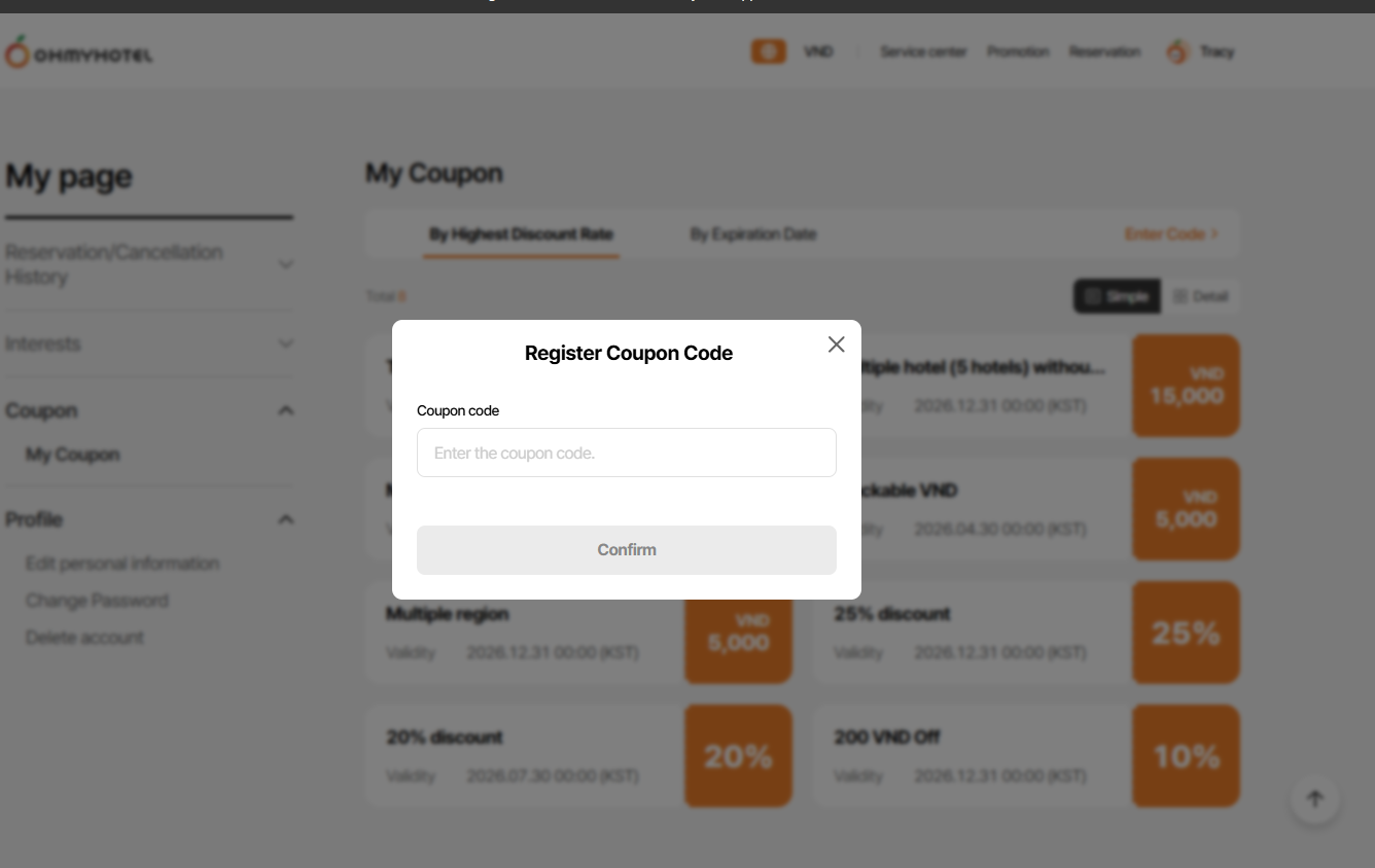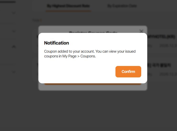Requirement: 쿠폰이 등록되었습니다. 등록된 쿠폰은 ‘마이페이지 > 쿠폰’에서확인하실 수 있습니다.
