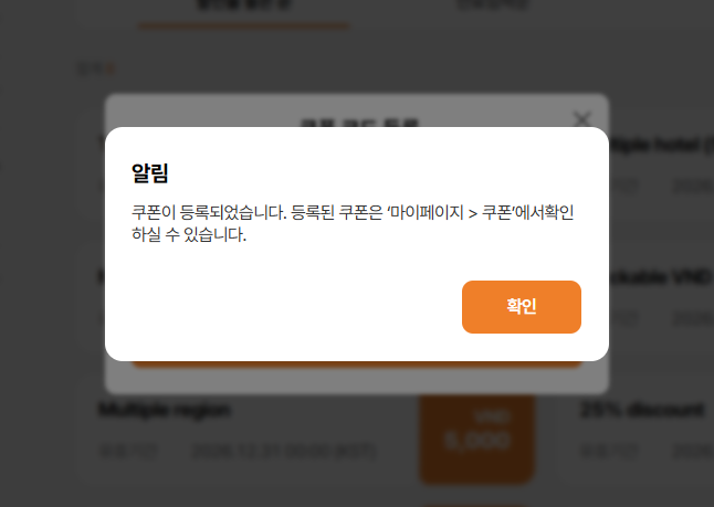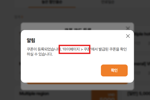 Current: 쿠폰이 등록되었습니다. '마이페이지 > 쿠폰'에서 발급된 쿠폰을 확인하실 수 있습니다.