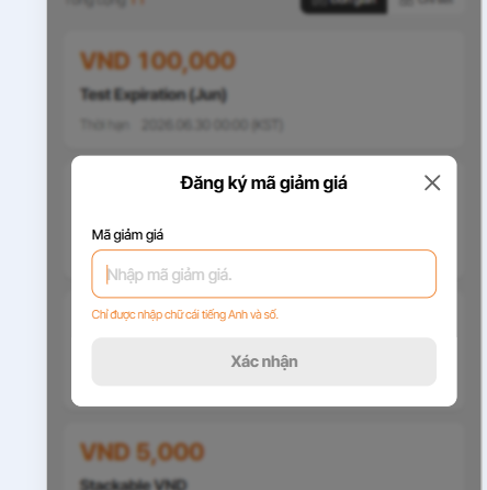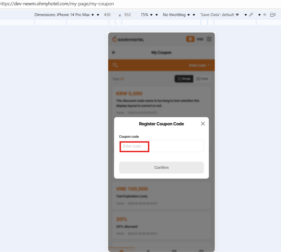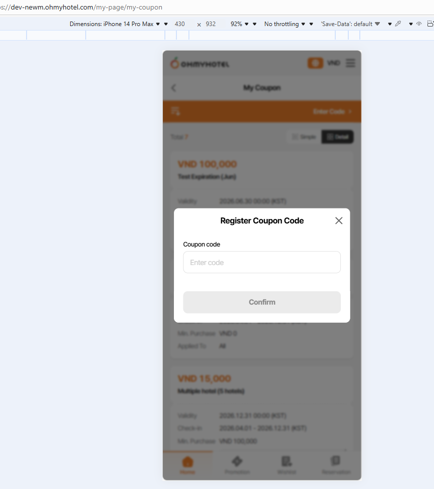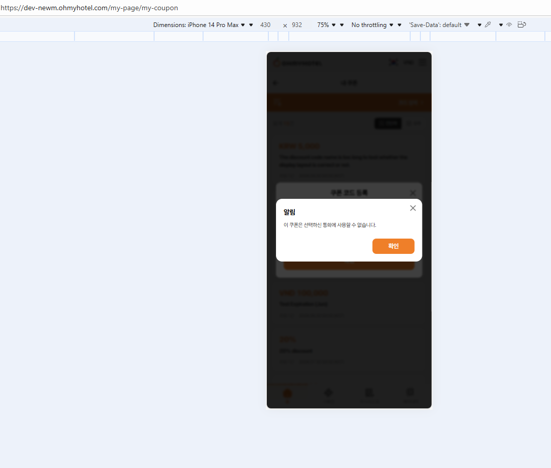 Current: 쿠폰이 등록되었습니다. '마이페이지 > 쿠폰'에서 발급된 쿠폰을 확인하실 수 있습니다.7. Coupon has registered but when enter code, alert save success is displayed