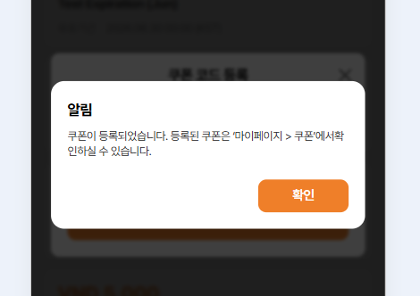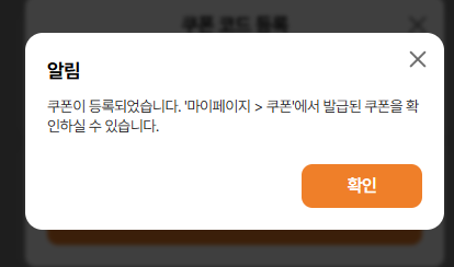 Current: 쿠폰이 등록되었습니다. '마이페이지 > 쿠폰'에서 발급된 쿠폰을 확인하실 수 있습니다.