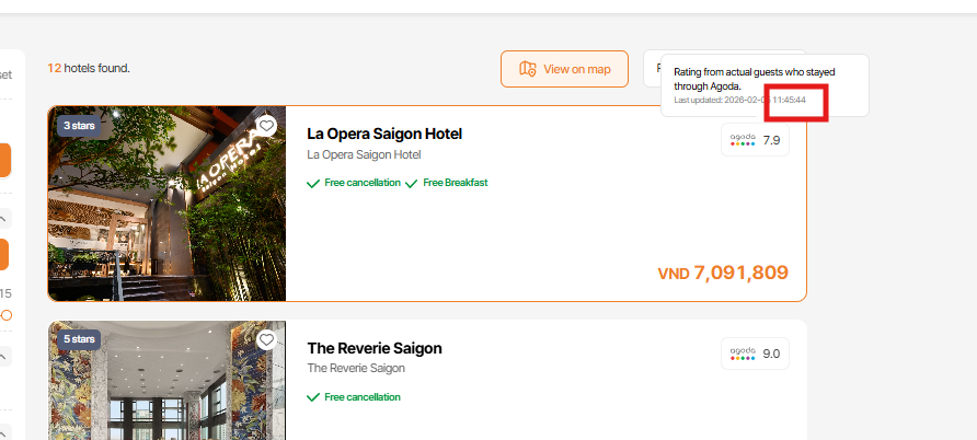 2. Based on the date searched by the user , the price of the cheapest room at that hotel is displayed.