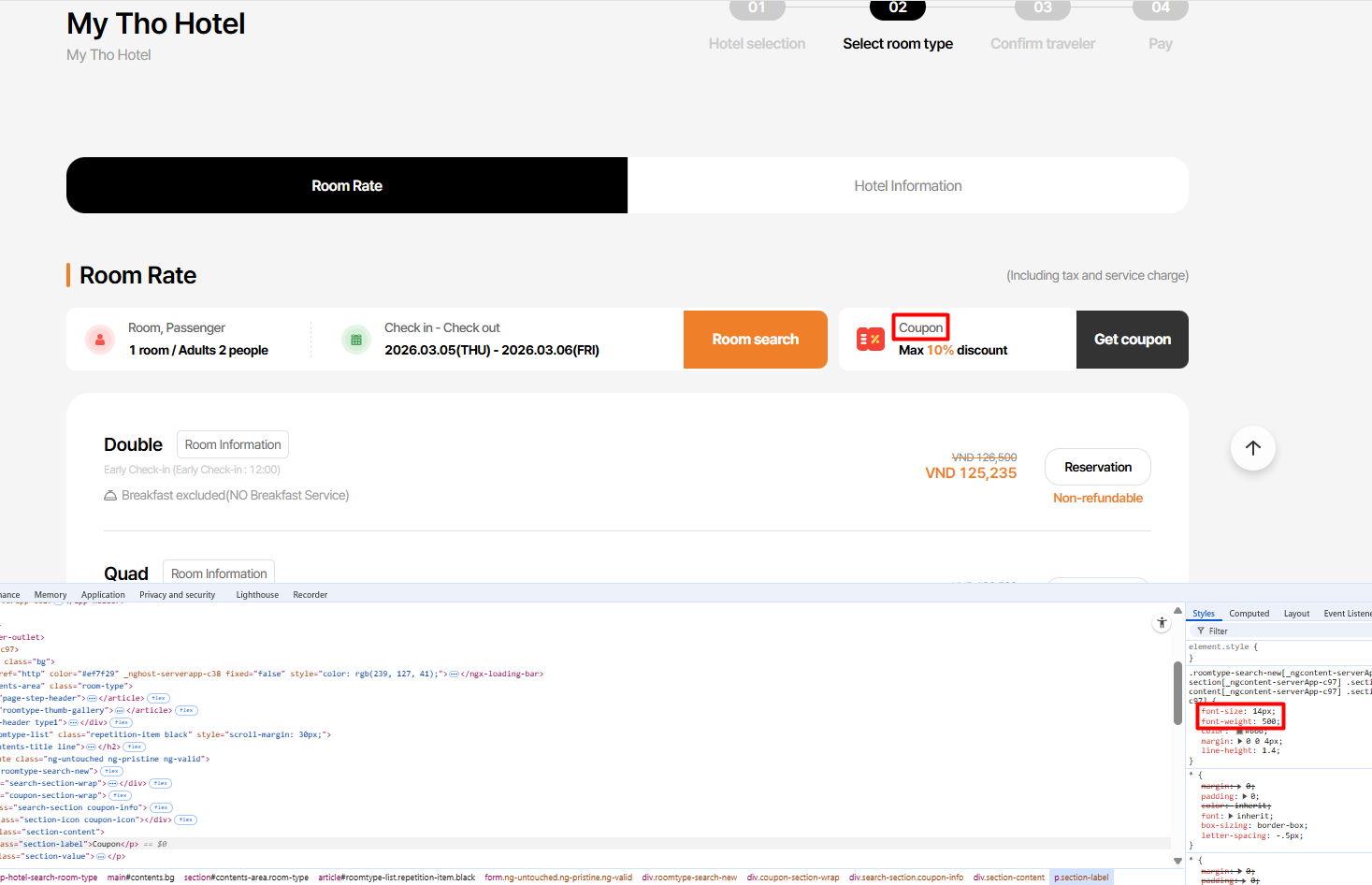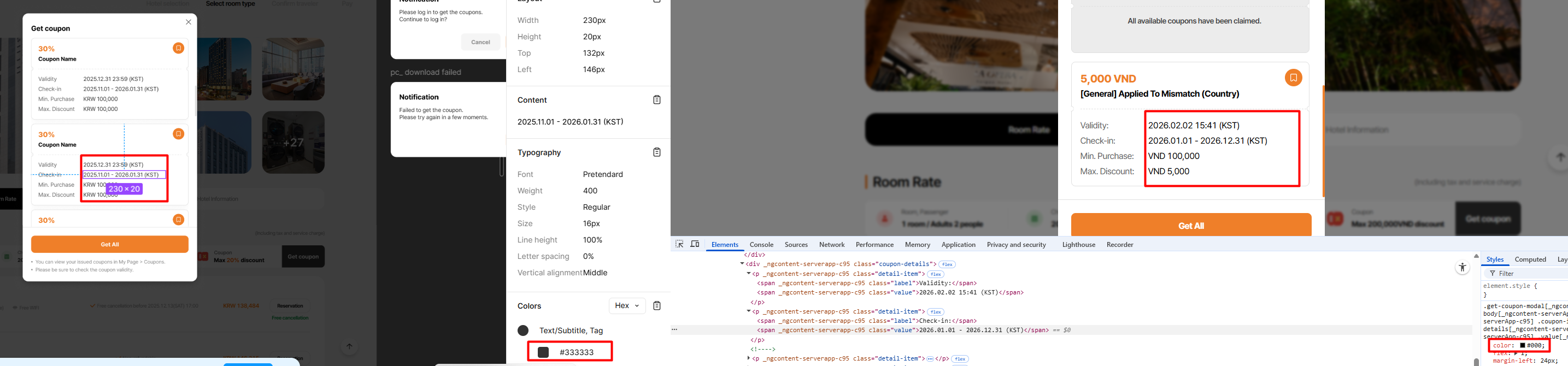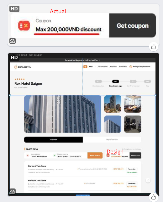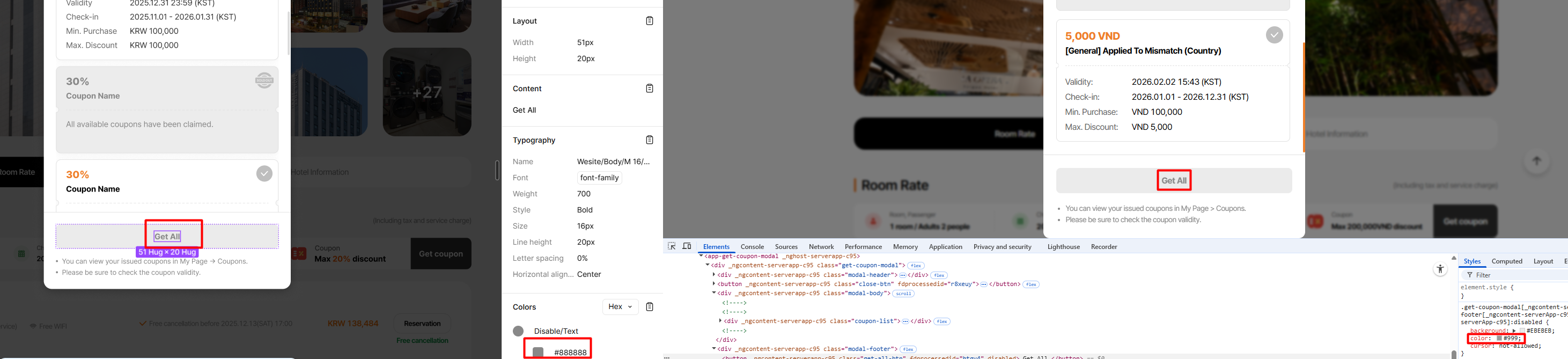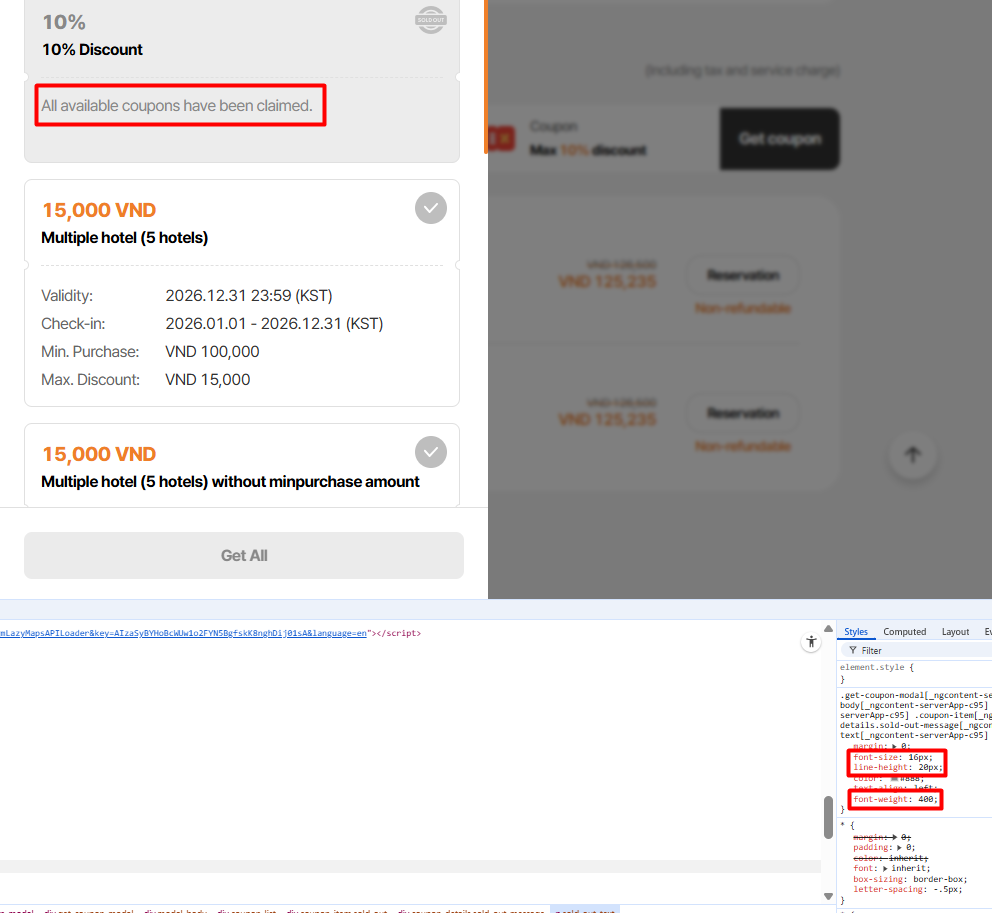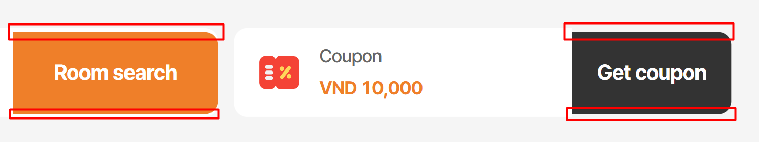 14. “Room search” và “Get coupon” buttons are misaligned and not vertically matching the white coupon textbox layout