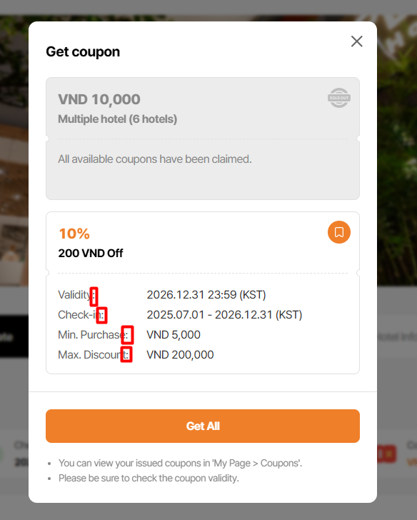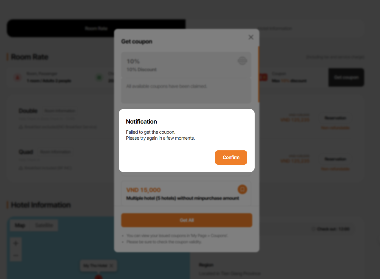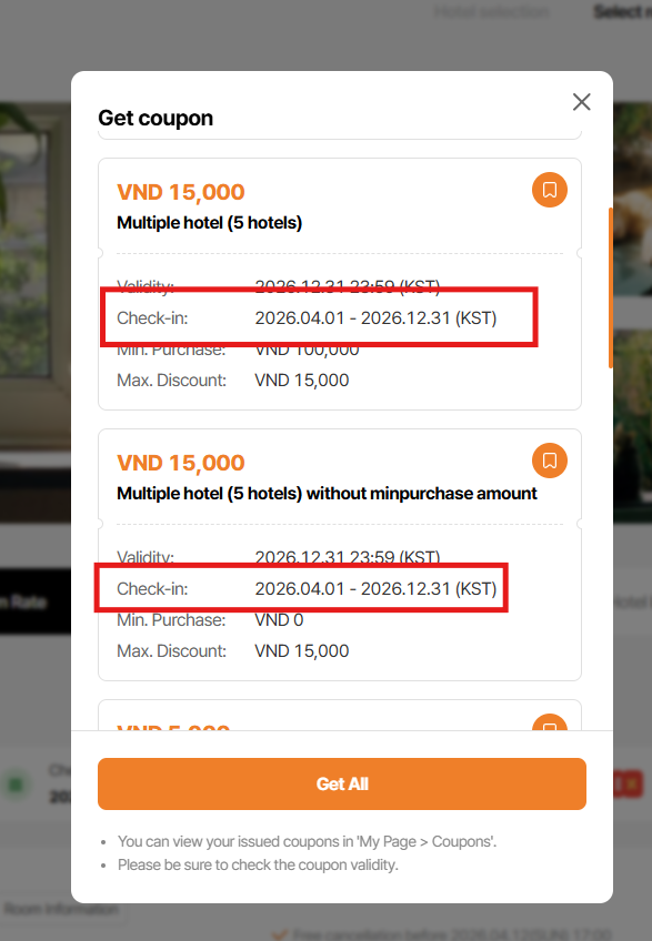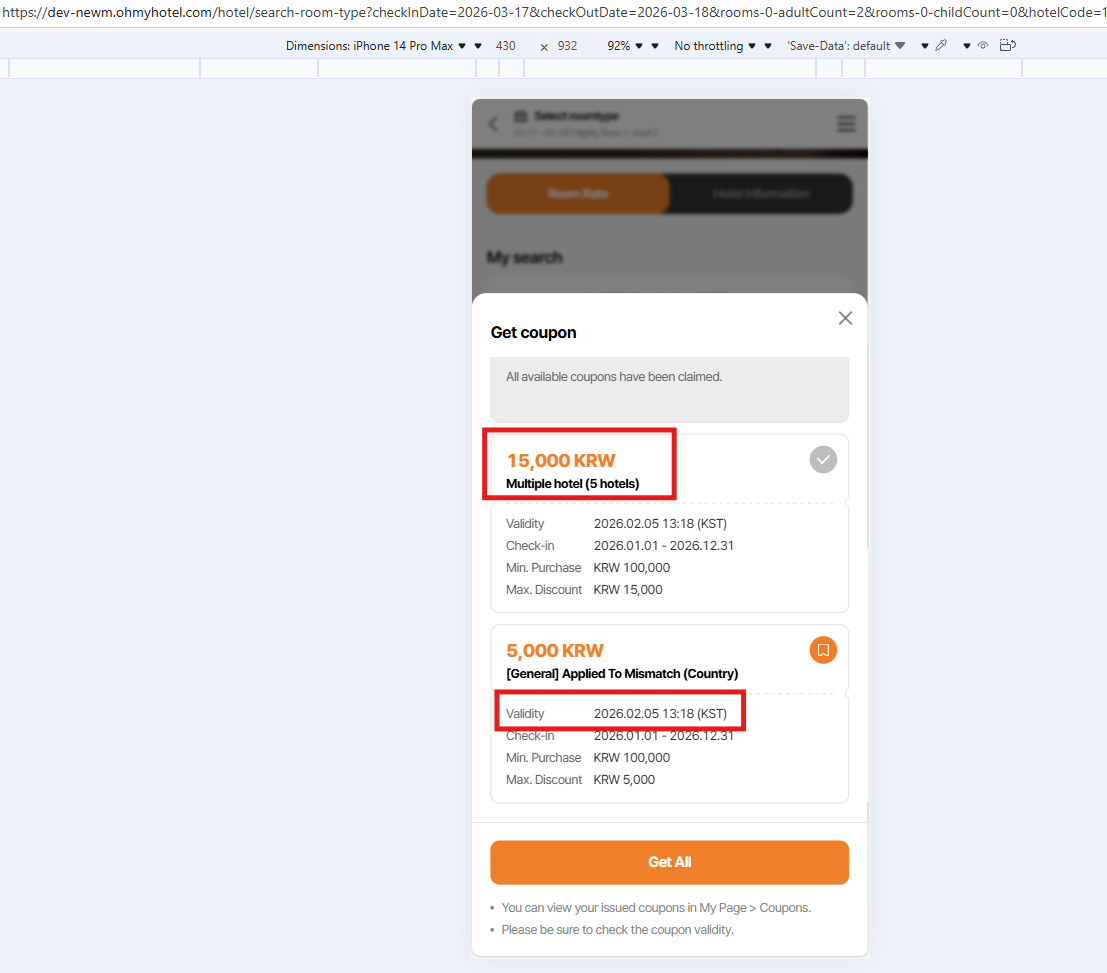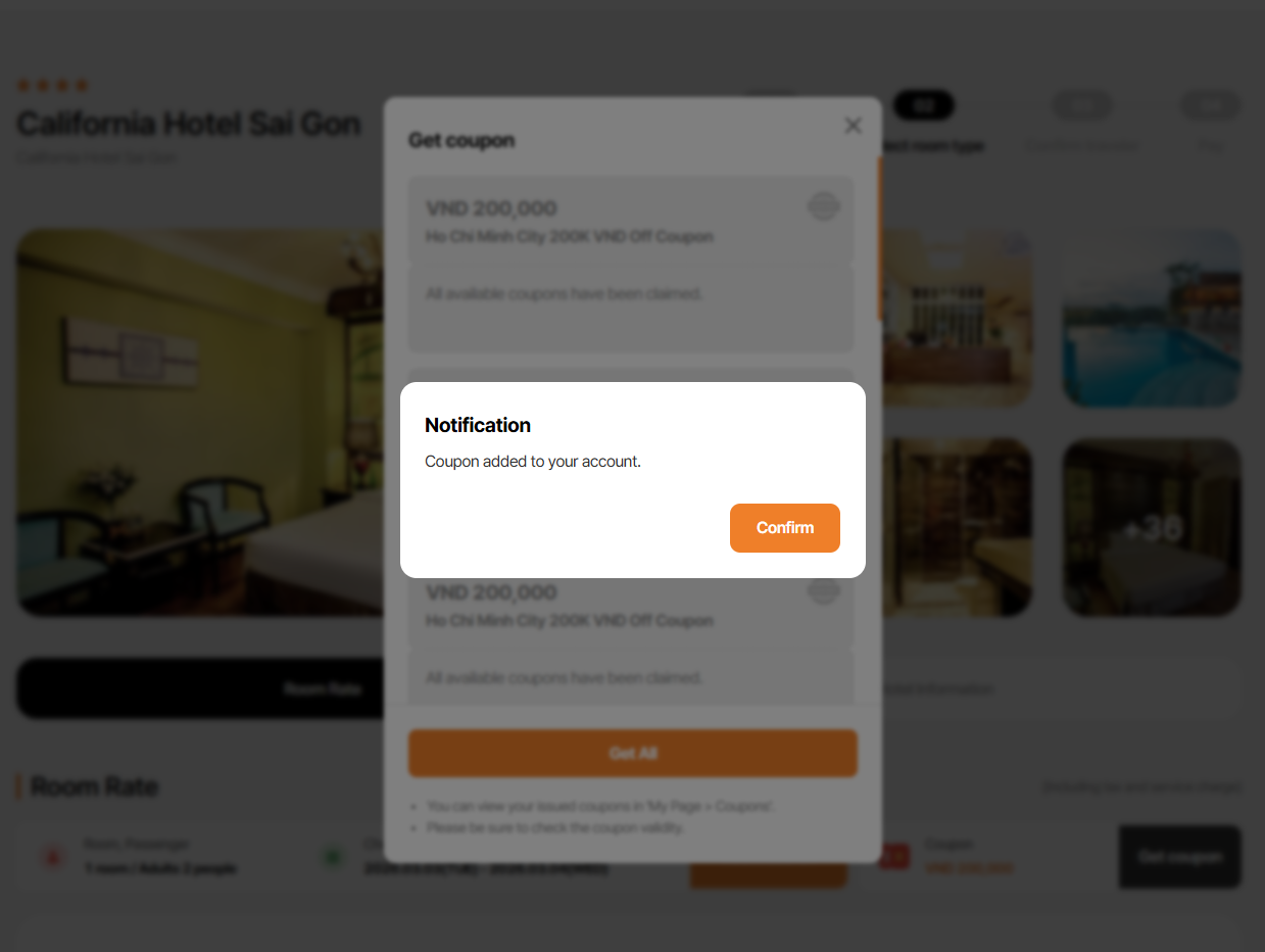 Note: On get coupon modal, coupon for country/region/all is not display due to DEV is still working for this field. Currently, only coupon apply to that hotel is display