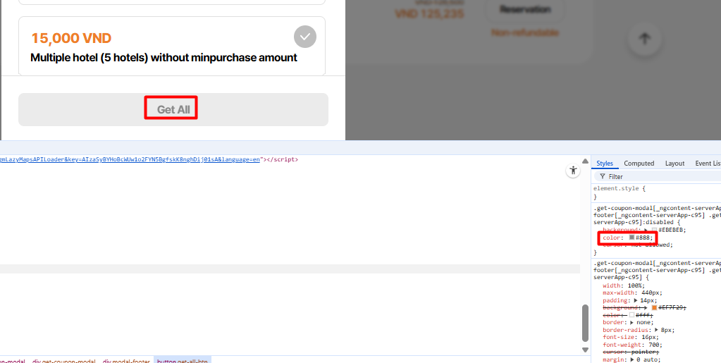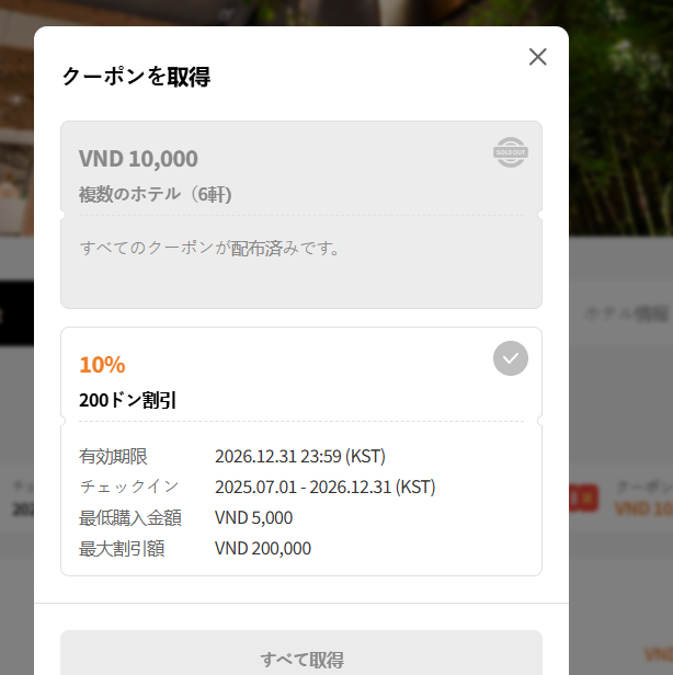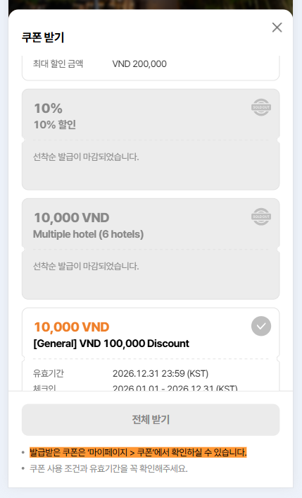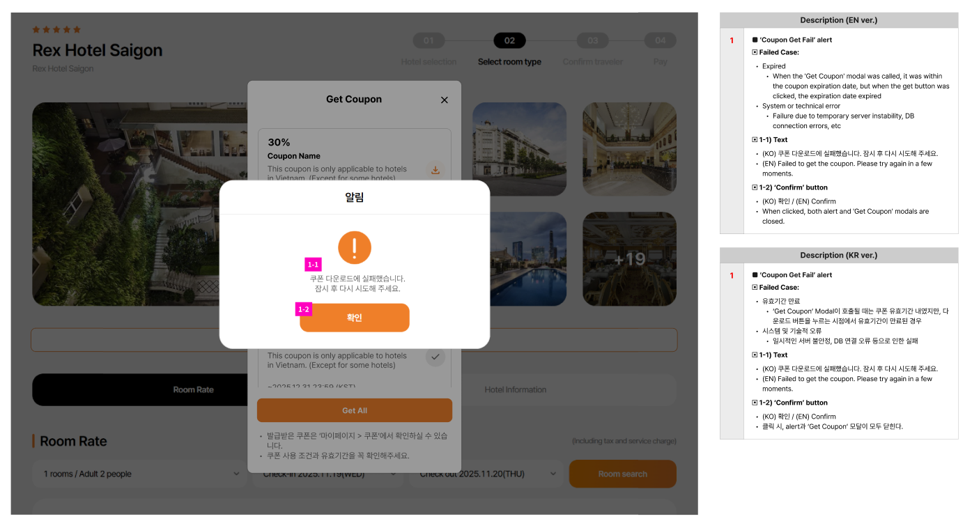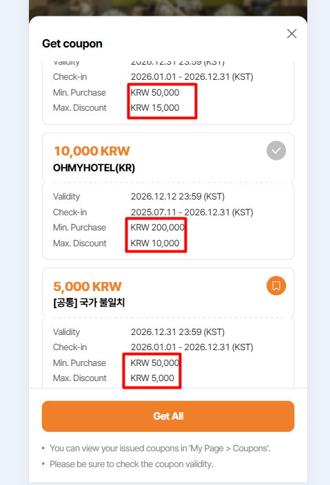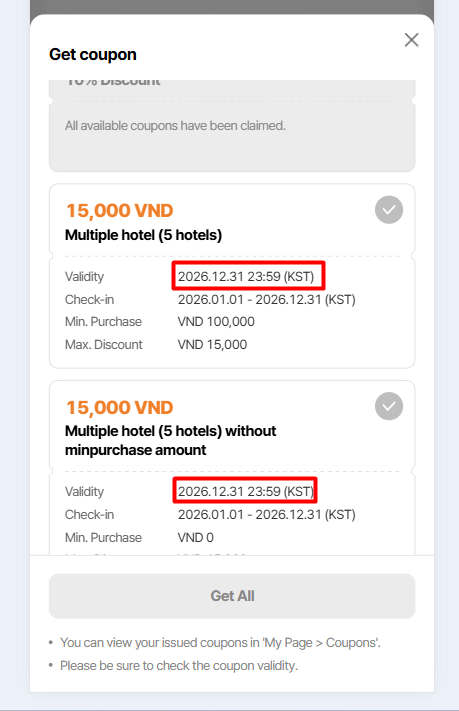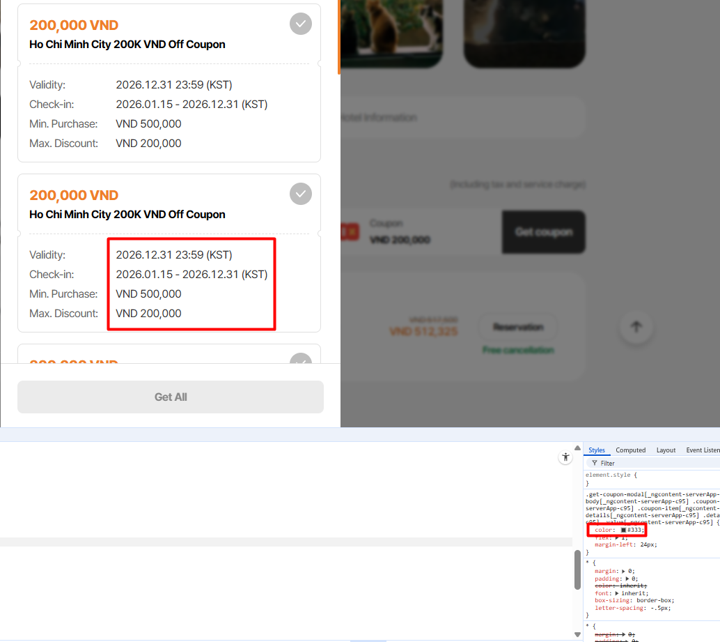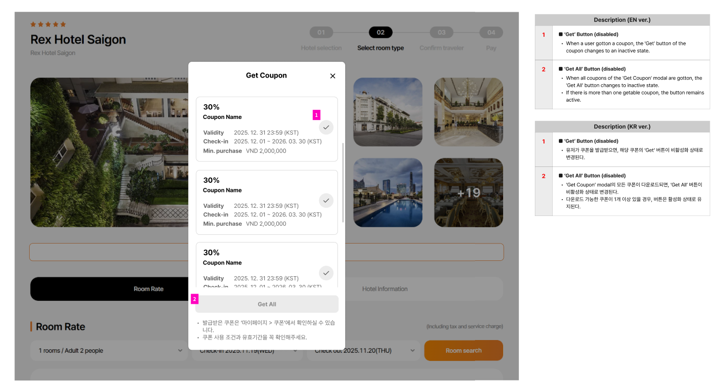 Note: On get coupon modal, coupon for country/region/all is not display due to DEV is still working for this field. Currently, only coupon apply to that hotel is display