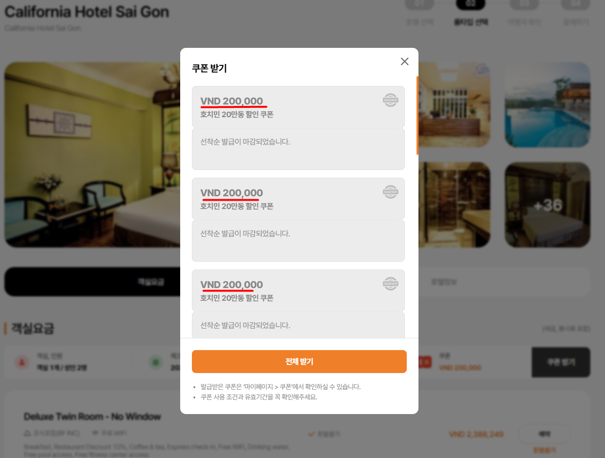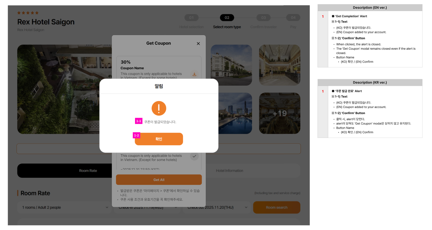 2. Select room page > click get coupon button > observe on coupon list