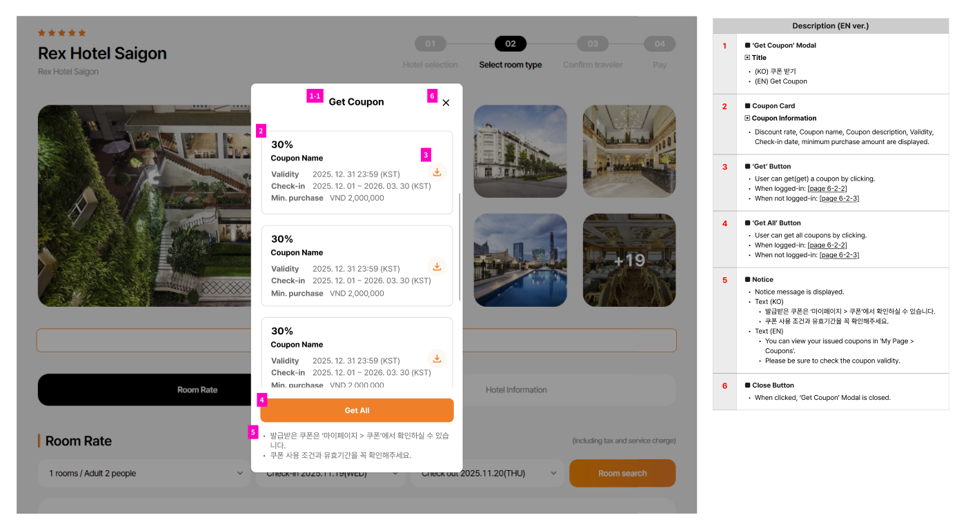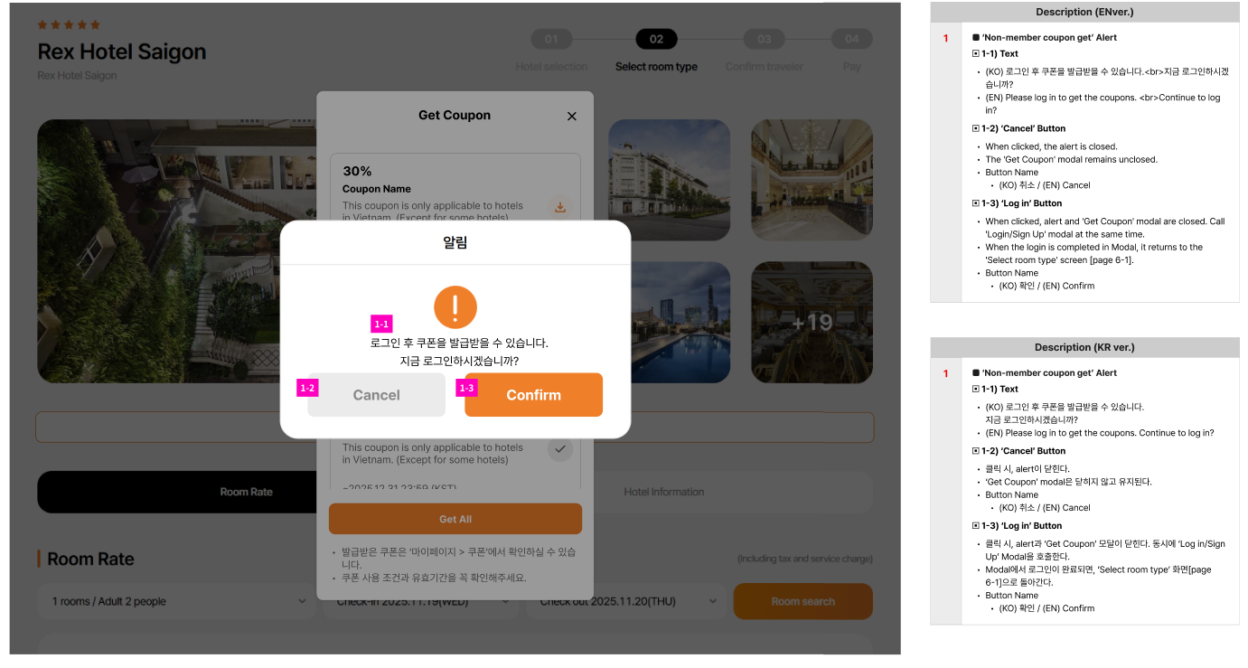 10. Non-member => Click Get coupon => Show Get coupon popup => Click Download icon => Show Notification popup with description 'Please log in to get the coupons.' Continue to log in? Cancel and Confirm buttons => If click Cancel button, popup will close => If click Confirm button, alert and 'Get Coupon' modal are closed. Call 'Login/Sign Up' modal at the same time => When the login is completed in Modal, it returns to the 'Select room type' screen [page 6-1].