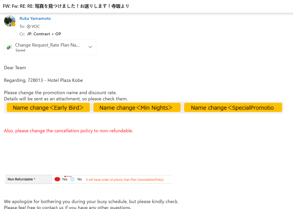 Please support to change the promotion name as attached file. And the cancellation policy of these pormotion must be changed to Non-refundable.