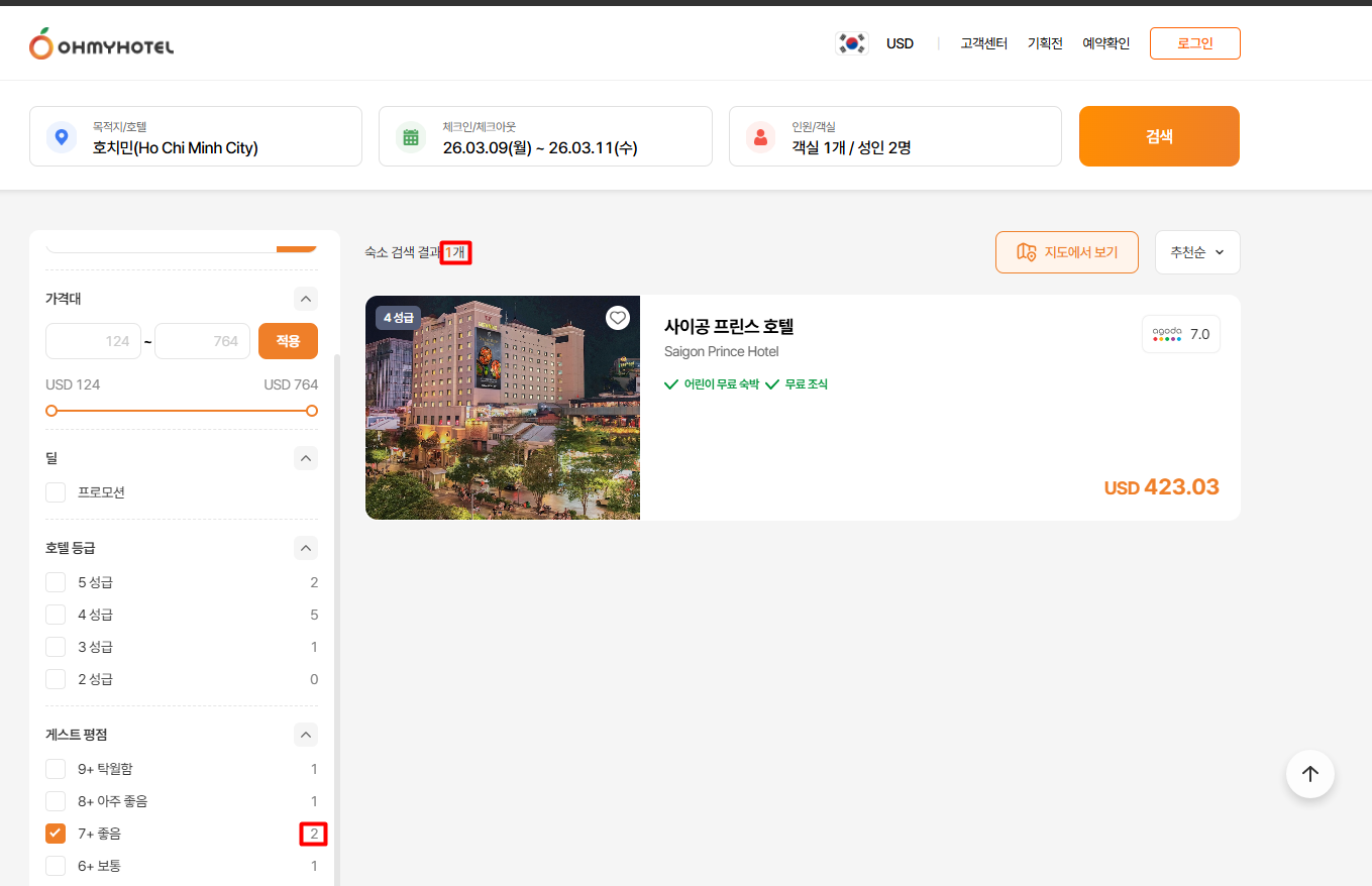 29. KO language, search HCM, 26.03.09 - 26.03.11 => The exact hotel number should be displayed